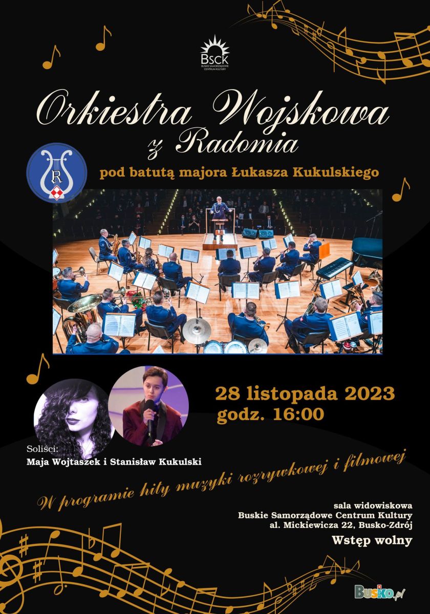 Zapraszamy wszystkich miłośników muzyki na wyjątkowy koncert Orkiestry Wojskowej z Radomia pod batutą majora Łukasza Kukulskiego. To niezwykłe wydarzenie, pełne muzyki rozrywkowej i filmowej, odbędzie się 28 listopada o godzinie 16:00 w sali widowiskowej Buskiego Samorządowego Centrum Kultury. Wstęp wolny!