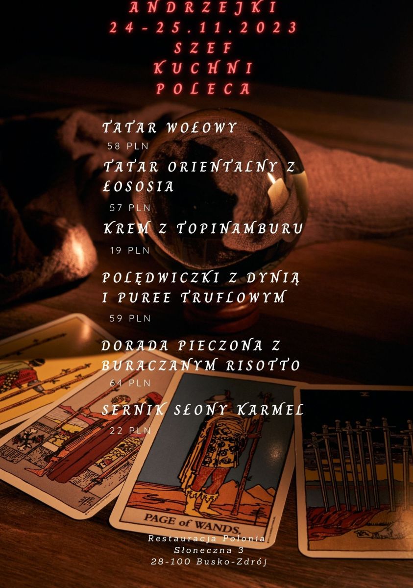 Wspaniałe Menu Szefa Kuchni: Hubert Misterkiewicz przygotował specjalne menu, które dostępne będzie przez cały weekend. Nasza kolacja to doskonała alternatywa dla tych, którzy pragną spędzić andrzejkowy wieczór w kameralnym gronie, delektując się wybornym smakiem naszych potraw.