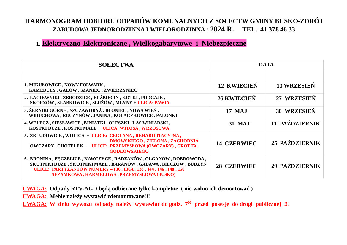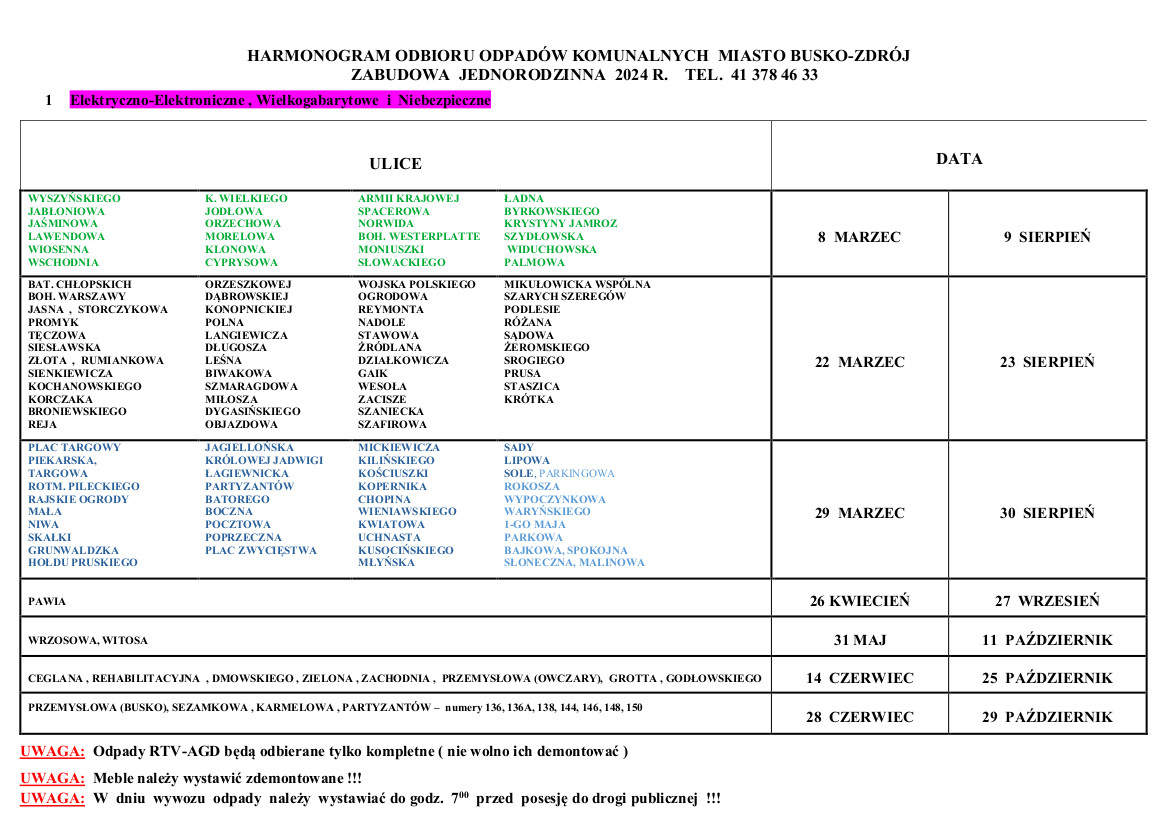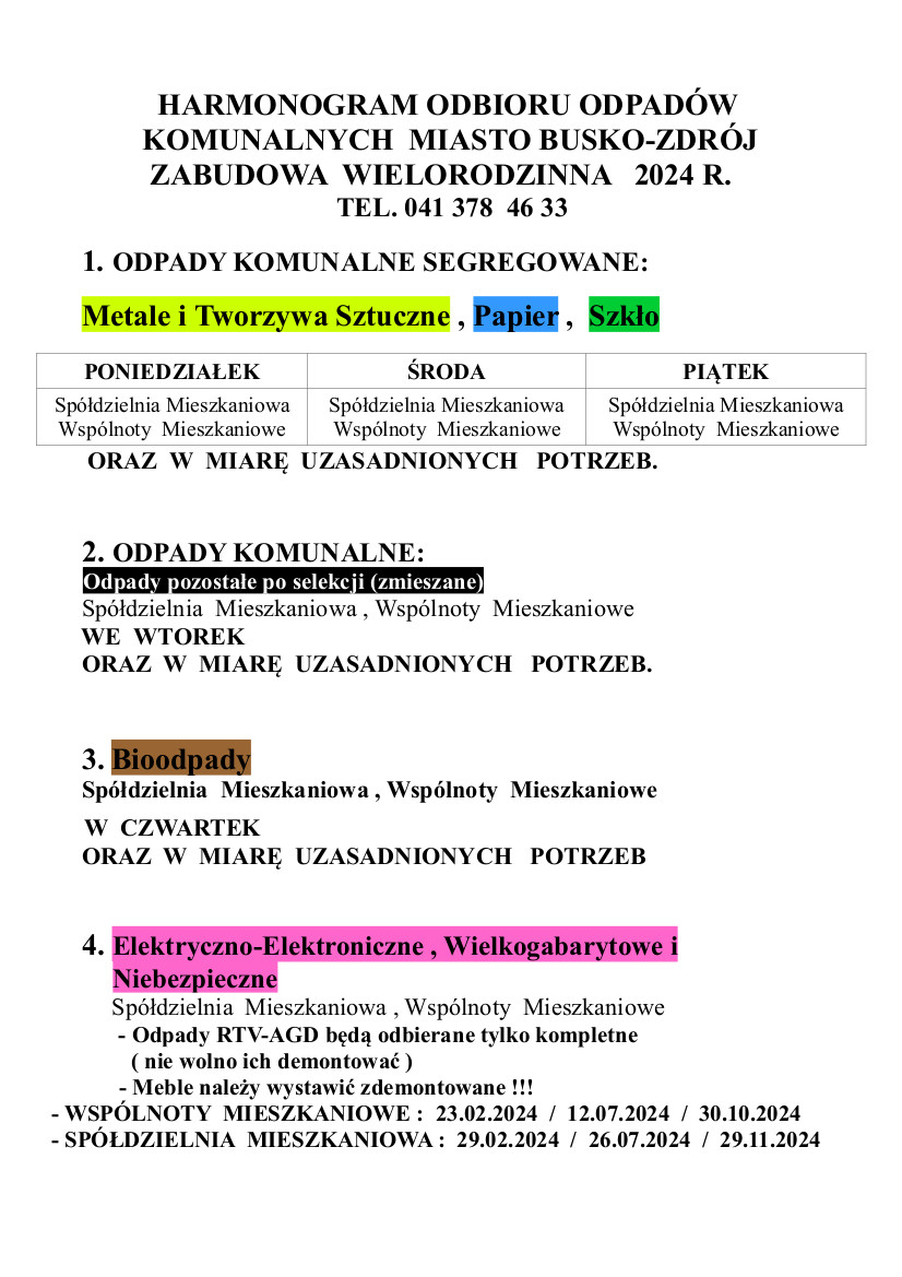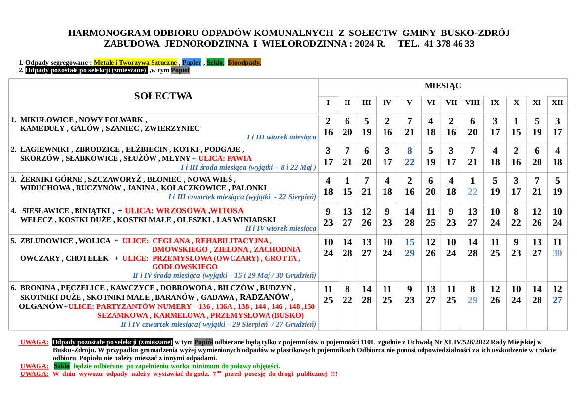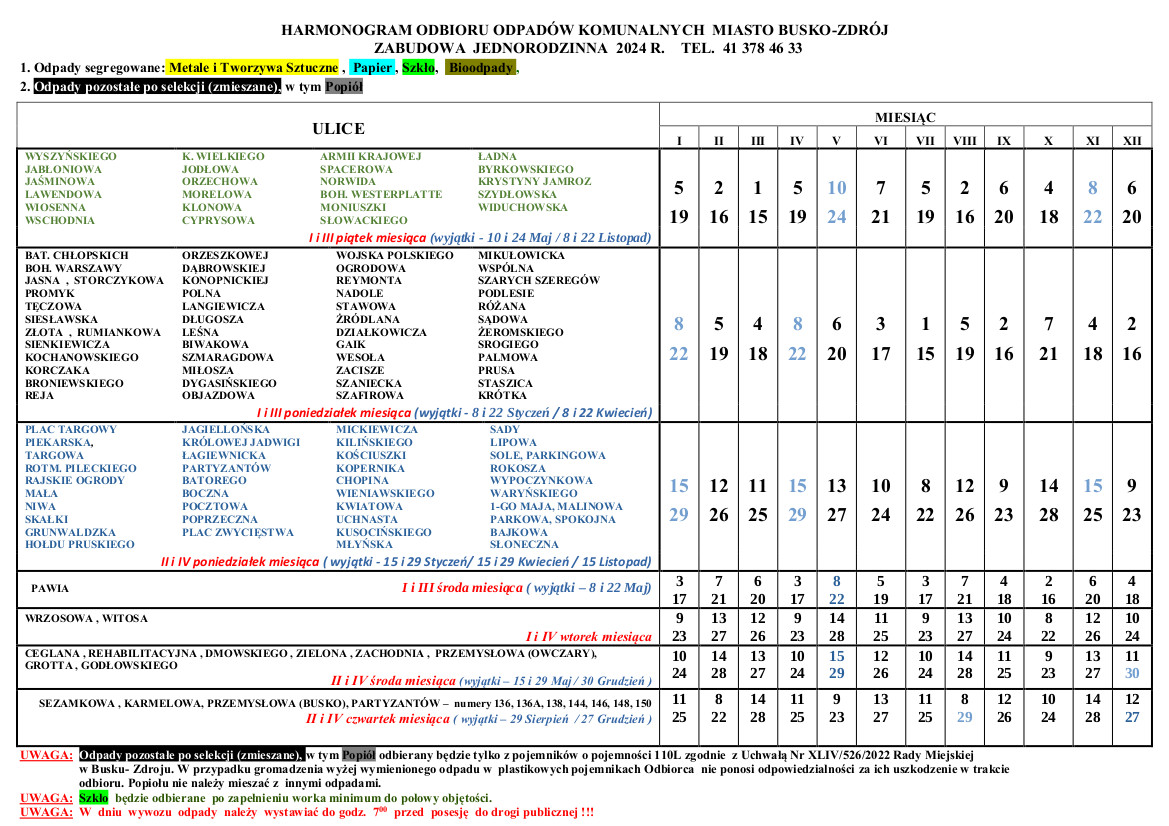 Harmonogram odbioru odpadów komunalnych Miasto Busko-Zdrój tel. 041 378 46 33