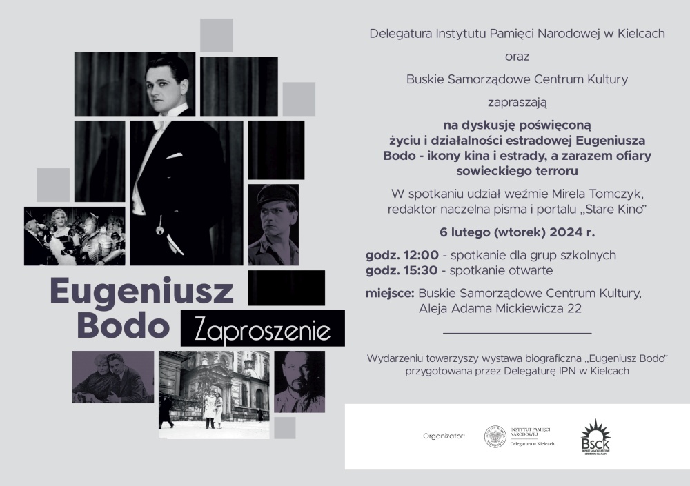 Delegatura IPN w Kiecach oraz Buskie Samorządowe Centrum Kultury serdecznie zapraszają na spotkanie poświęcone życiu i twórczości estradowej legendarnego aktora Eugeniusza Bodo. Wydarzenie odbędzie się we wtorek, 6 lutego, o godzinie 15:30.