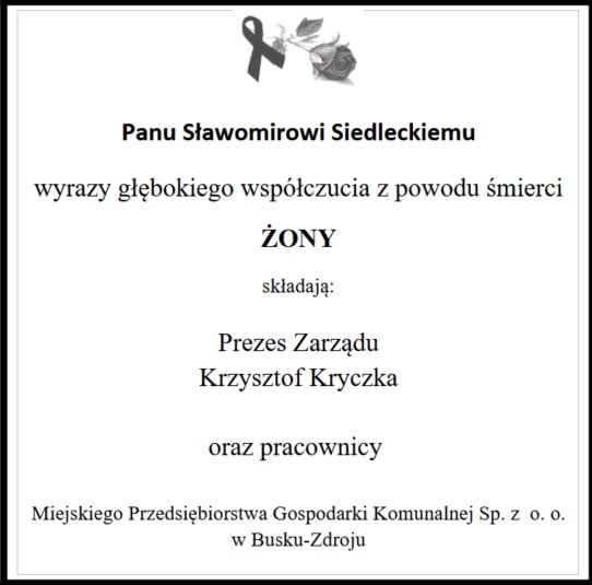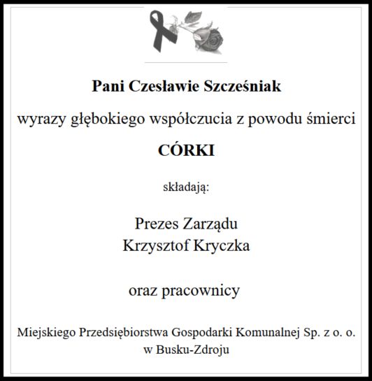 Wyrazy głębokiego współczucia Pani Czesławie Szcześniak z powodu śmierci CÓRKI oraz Panu Sławomirowi Siedleckiemu z powodu śmierci ŻONY składają: Prezes Zarządu Krzysztof Kryczka oraz pracownicy Miejskiego Przedsiębiorstwa Gospodarki Komunalnej Sp. z o.o. w Busku-Zdroju.