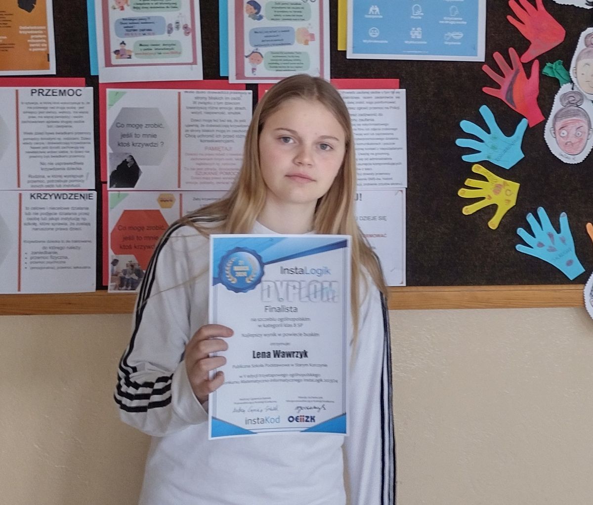 Miło nam poinformować, iż uczennica klasy 8 Publicznej Szkoły Podstawowej w Starym Korczynie - Lena Wawrzyk została finalistką Ogólnopolskiego Konkursu Matematyczno-Informatycznego InstaLogik 2023/2024.