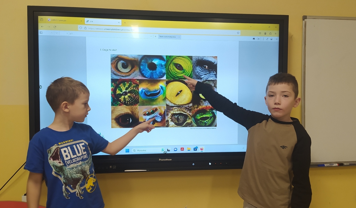 Podczas lekcji uczniowie dowiedzieli się jak widzą zwierzęta. Obejrzeli film obrazujący sposób widzenia poszczególnych zwierząt. Za pomocą wiązki słomek pierwszoklasiści mogli zobaczyć jak widać świat okiem owada. Klasa poznała pojęcie daltonizmu, krótkowzroczności i dalekowzroczności. Uczniowie oglądali iluzje optyczne, które oszukują nasze oczy i mózg. Dzieci dowiedziały się również że ćmy, żaby czy ryby posiadają wzory podobne do oczu - takie ,,fałszywe oczy’’ mają za zadanie ochronić ,,prawdziwe’’ oczy przed drapieżnikami, wówczas ofiara ma szansę na ucieczkę.