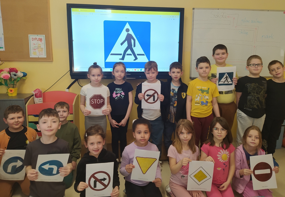 Uczniowie powtórzyli zasady drogowe, które powinni przestrzegać piesi oraz poznali podstawowe znaki. Na podstawie narysowanego planu miasta, za pomocą sznureczka, odwzorowywali na podłodze schemat ulic, umieszczali również w pobliżu dróg kartki z nazwami obiektów takich jak: kino, sklep, park, plac zabaw, szkoła. Następnie dzieci przechadzały się wspólnie zbudowanymi ,,ulicami’’, zatrzymując się przy poszczególnych budynkach.