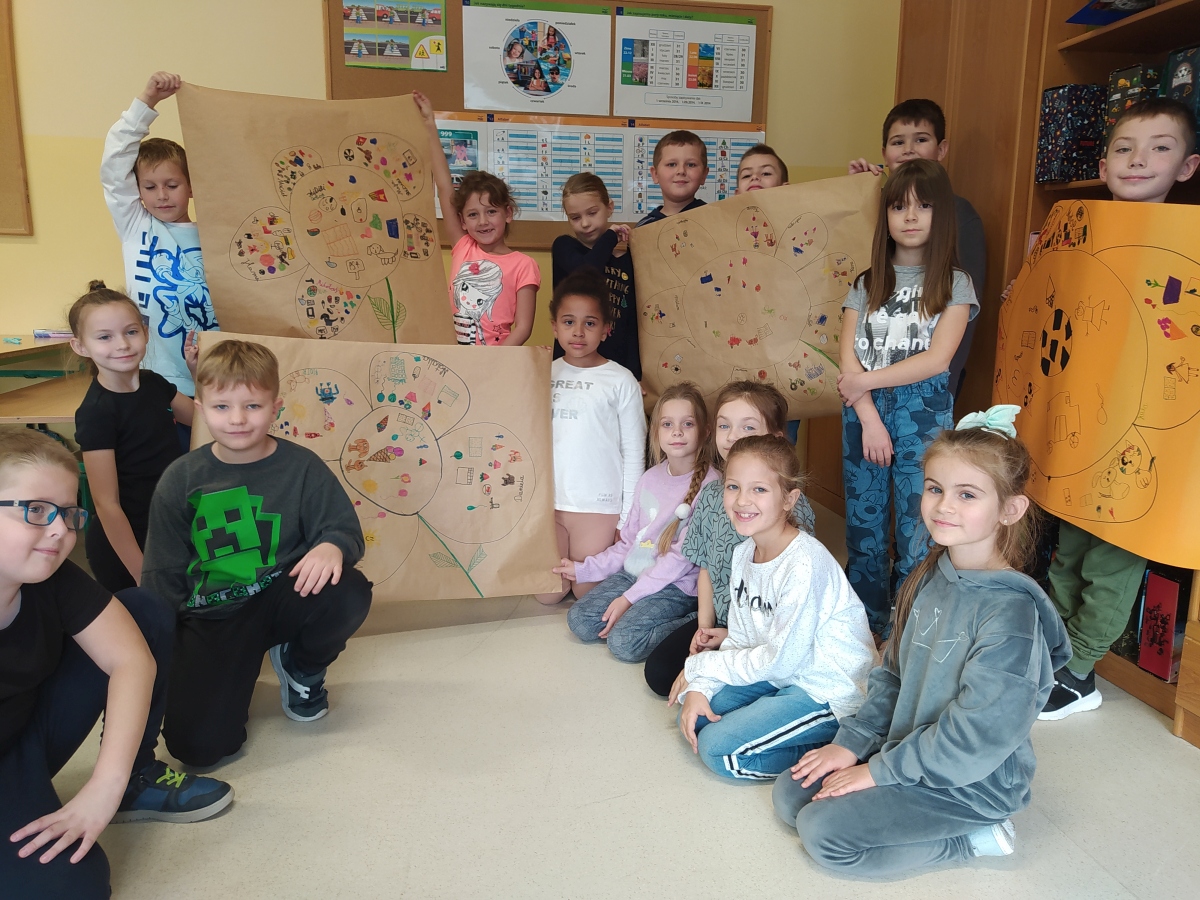 Uczniowie uczyli się współpracy, poznawali zainteresowania kolegów i koleżanek. Dzieci pracowały w grupach i wykonywały wspólną pracę plastyczną, dzięki czemu dowiedziały się co ich łączy, prezentowały swoje rysunki na forum (na płatkach kwiatka każde dziecko rysowało swoje zainteresowania, następnie w środku malowały te wspólne dla grupy).