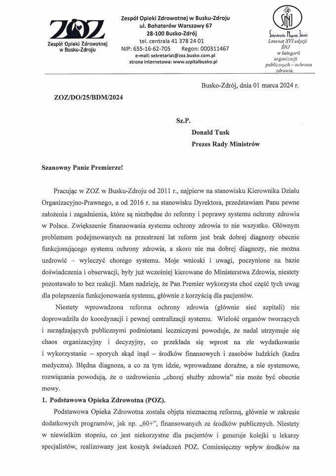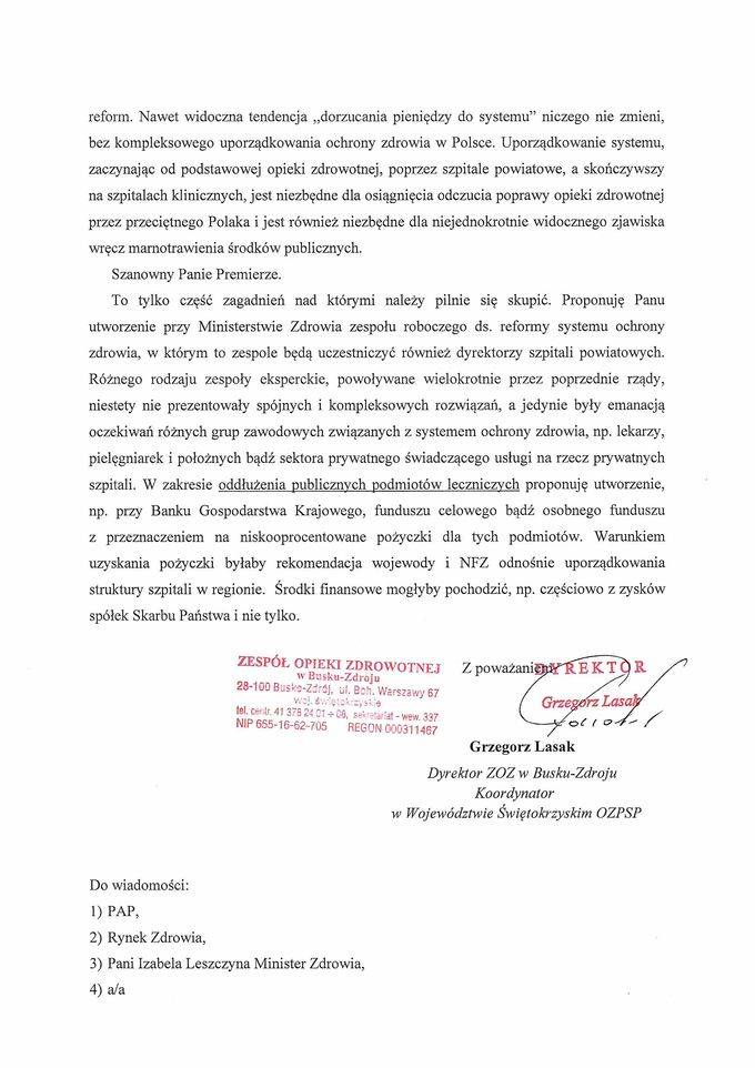 W związku z licznymi pytaniami odnośnie pisma skierowanego przez Dyrektora ZOZ w Busku-Zdroju Grzegorza Lasaka do Premiera Rządu RP Donalda Tuska zawierającego postulaty do koniecznej reformy ochrony zdrowia w Polsce, przedstawiamy Państwu treść przedmiotowego pisma.