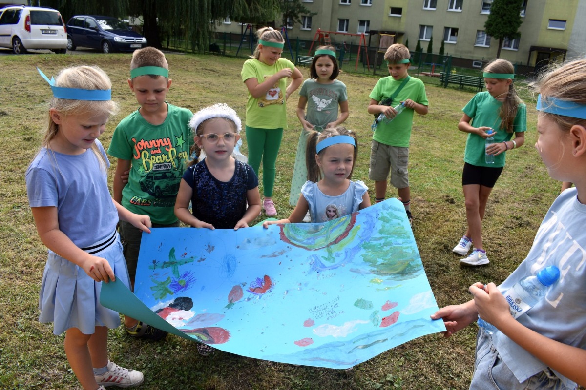 Po zakończeniu pracy nad plakatami przyszedł czas na przygotowanie okrzyków. Każda grupa wymyśliła krótkie hasło, które podkreślało ich jedność oraz entuzjazm. Ta część zajęć sprzyjała dalszej integracji i pozwoliła dzieciom wyrazić radość oraz zaangażowanie w kreatywny sposób.