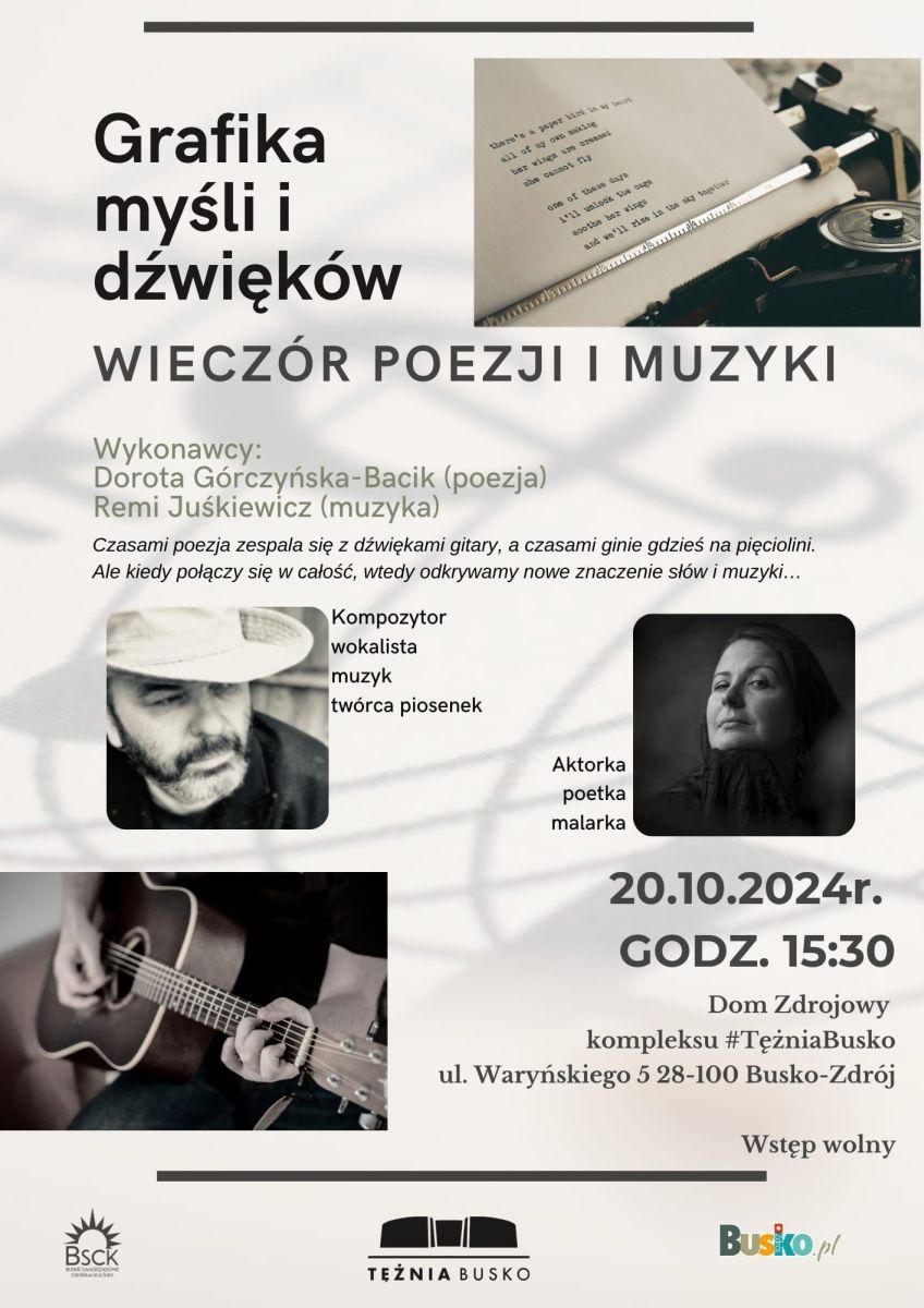 Dom Zdrojowy przy buskiej Tężni zaprasza na wyjątkowy wieczór muzyczno-poetycki pod nazwą 'Grafika Myśli i Dźwięków'. W niedzielę, 20 października 2024 r., o godzinie 15:30, odbędzie się spotkanie z udziałem Doroty Górczyńskiej-Bacik oraz Remiego Juśkiewicza, którzy zaprezentują autorski projekt łączący poezję z muzyką.