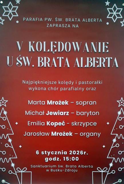 Zapraszamy na wyjątkowe wydarzenie muzyczne - V Kolędowanie u św. Brata Alberta, które odbędzie się 6 stycznia 2026 roku o godzinie 15:00 w Sanktuarium św. Brata Alberta w Busku-Zdroju.