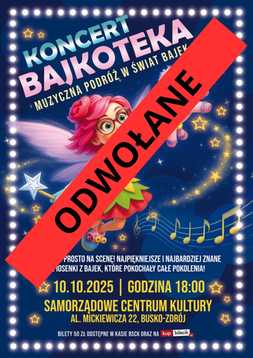 Organizator poinformował o odwołaniu zaplanowanego na dziś wydarzenia „Bajkoteka – Muzyczna Podróż w Świat Bajek”, które miało odbyć się w Busku-Zdroju. Informacja o zmianie została opublikowana na portalu KupBilecik.pl, gdzie wcześniej prowadzona była sprzedaż biletów.