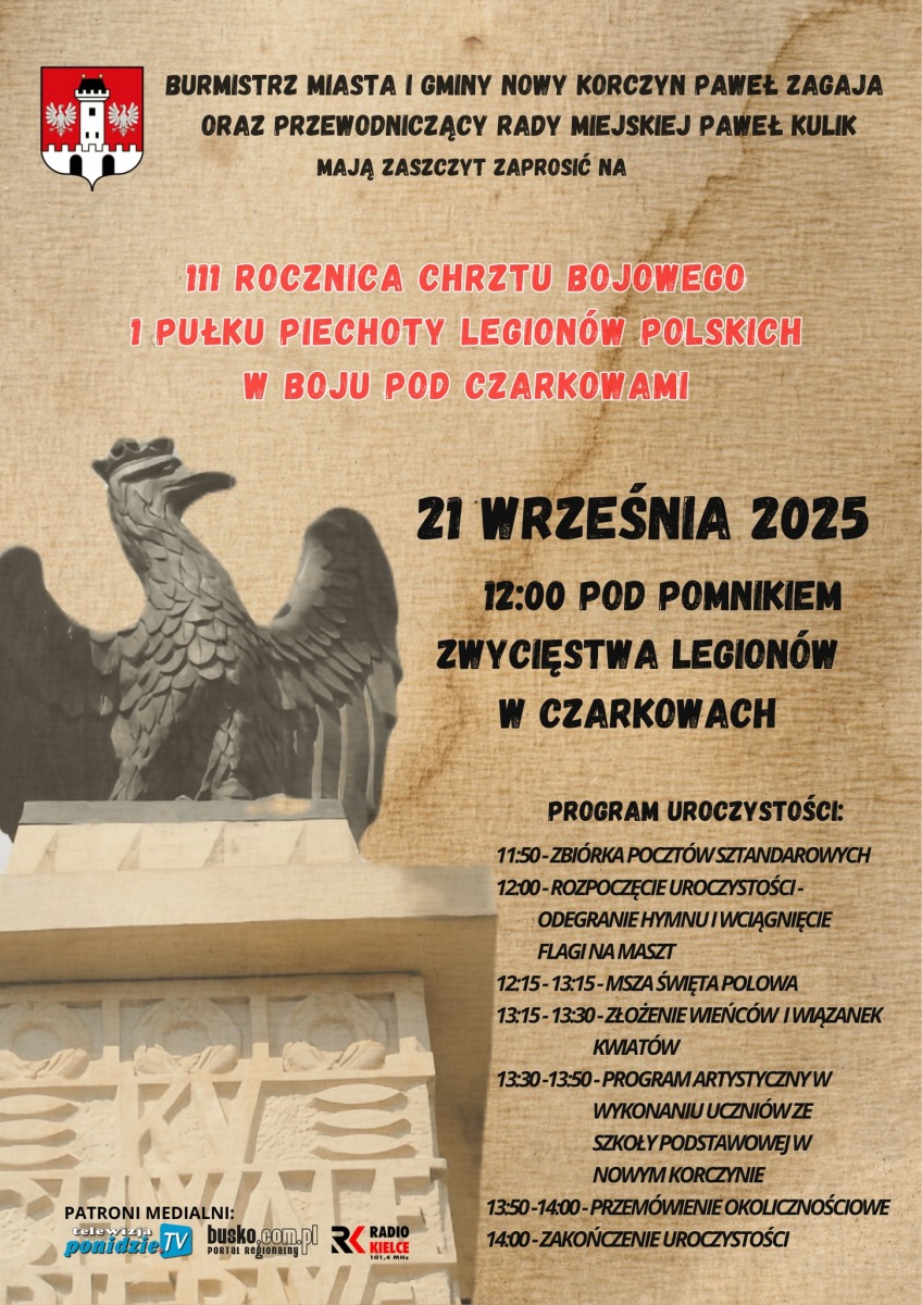 W niedzielę, 21 września 2025 roku, o godzinie 12:00 pod Pomnikiem Zwycięstwa Legionów w Czarkowach odbędą się uroczystości upamiętniające 111. rocznicę chrztu bojowego 1 Pułku Piechoty Legionów Polskich. Organizatorem wydarzenia są Burmistrz Miasta i Gminy Nowy Korczyn Paweł Zagaja oraz Przewodniczący Rady Miejskiej Paweł Kulik.