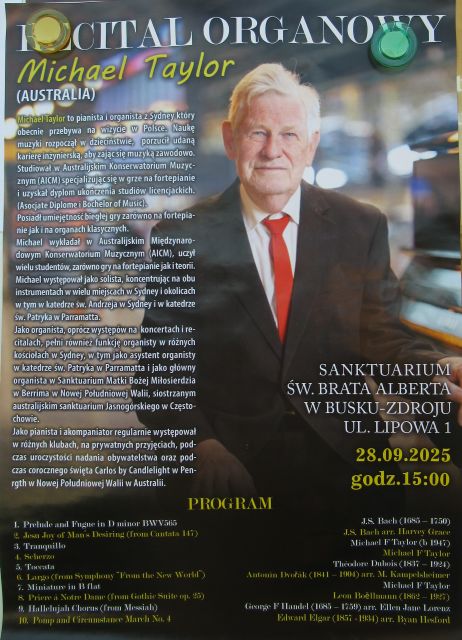 W niedzielę, 28 września 2025 roku, o godzinie 15:00 w Sanktuarium św. Brata Alberta w Busku-Zdroju odbędzie się recital organowy w wykonaniu australijskiego pianisty i organisty Michaela Taylora. Wydarzenie zapowiada się jako wyjątkowa okazja, by usłyszeć artystę o międzynarodowej renomie w kameralnej, sakralnej przestrzeni.