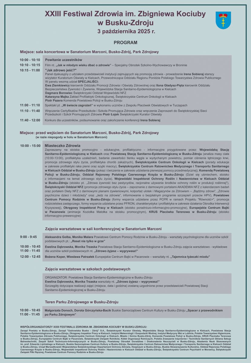 XXIII Festiwal Zdrowia im. Zbigniewa Kociuby to inicjatywa, która od lat edukuje najmłodszych i dorosłych w zakresie zdrowia, bezpieczeństwa i profilaktyki chorób. Wydarzenie współorganizują m.in. Starostwo Powiatowe w Busku-Zdroju, Powiatowa Stacja Sanitarno-Epidemiologiczna w Busku-Zdroju, Wojewódzka Stacja Sanitarno-Epidemiologiczna w Kielcach, Buskie Samorządowe Centrum Kultury oraz liczne instytucje i organizacje wspierające działania prozdrowotne.