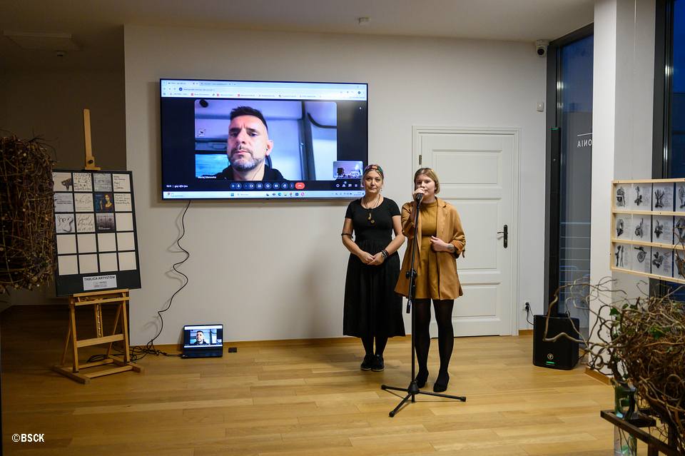 Kurator wystawy, dr Maciej Zdanowicz, połączył się z publicznością online prosto z pociągu, będąc w trakcie rezydencji artystycznej w Niemczech. Jego wirtualna obecność stała się symbolicznym dopełnieniem wieczoru, łącząc różne przestrzenie i formy komunikacji w duchu wystawy.