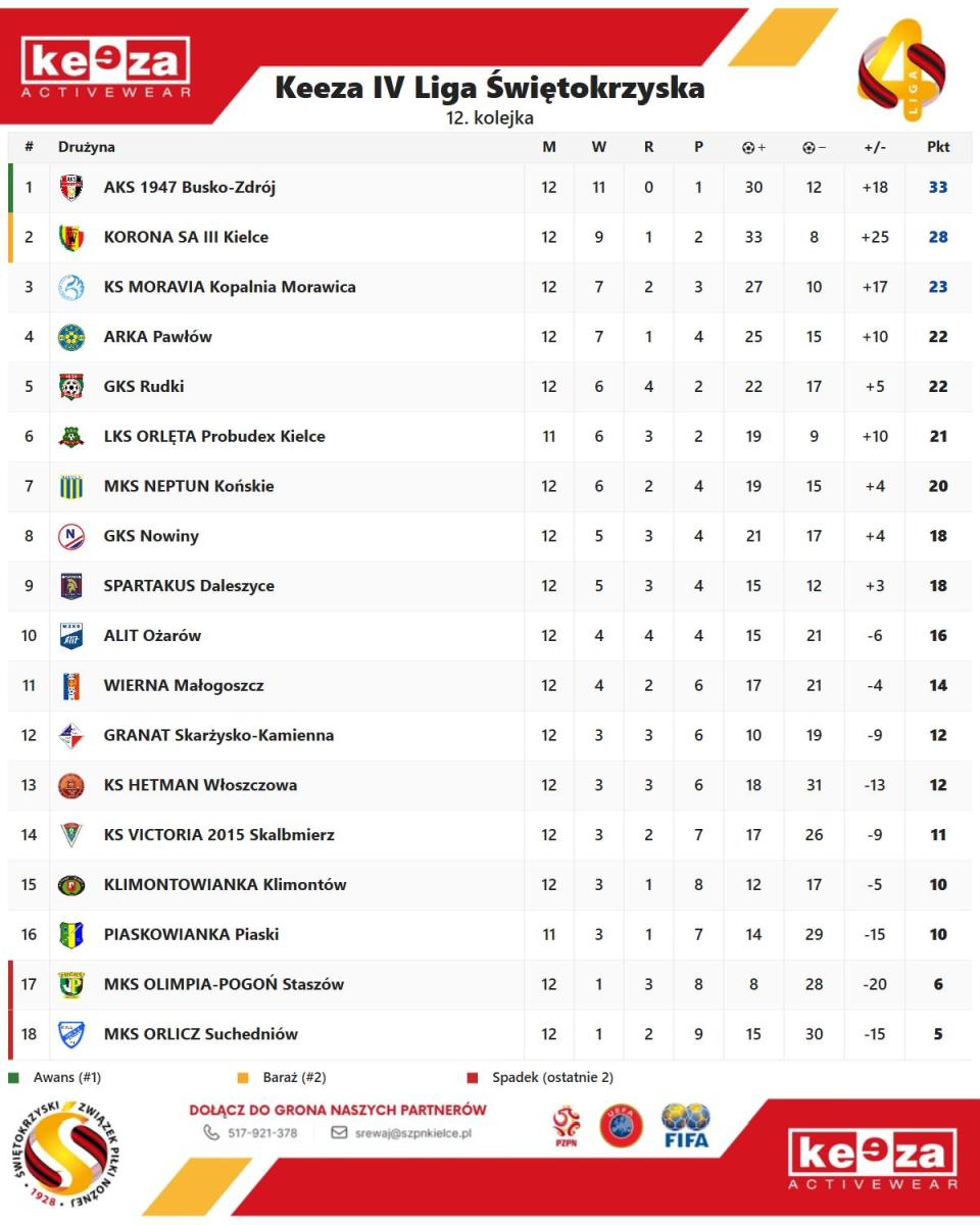 Po dwunastu kolejkach AKS 1947 Busko-Zdrój pozostaje liderem Keeza IV Ligi Świętokrzyskiej z dorobkiem 33 punktów, wyprzedzając Koronę SA III Kielce o pięć oczek.