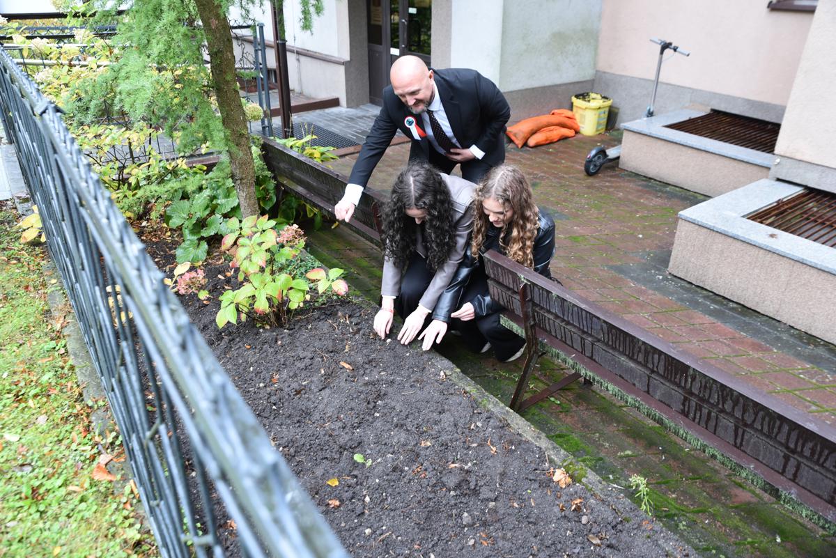 Na zakończenie uczniowie klas pierwszych posadzili 60 cebulek wiosennych kwiatów - każdy z nich symbolizował jeden rok działalności szkoły, a zarazem nowy początek i dalszy rozwój.