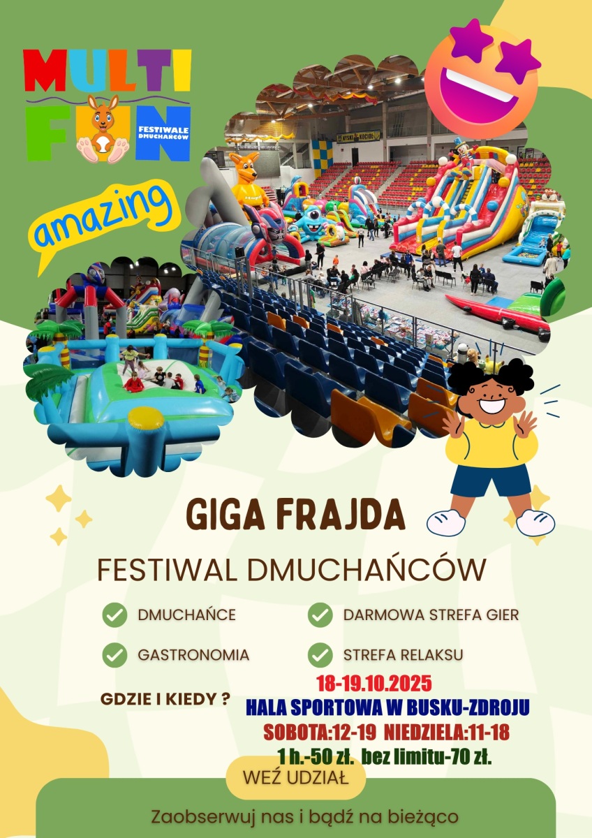 Pogoda nie rozpieszcza, a pomysłów na weekend z dziećmi brak? Warto wybrać się do Hali Sportowej przy ulicy Janusza Kusocińskiego 3 w Busku-Zdroju, gdzie w weekend, 18 i 19 października 2025 roku zagości Giga Frajda - Festiwal Dmuchańców. To doskonała propozycja na aktywne spędzenie czasu w kolorowej i pełnej radości atmosferze.