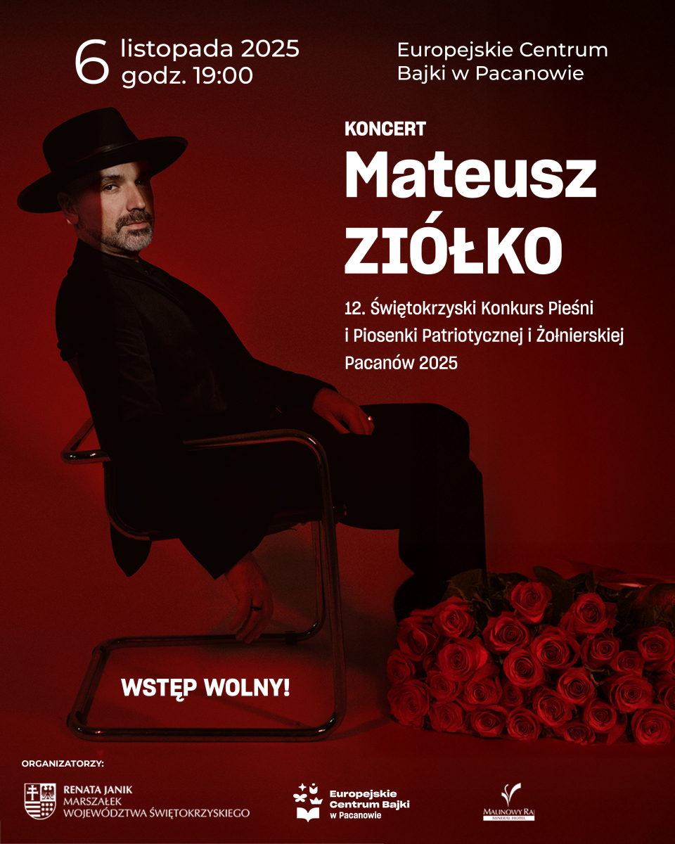 Występ Mateusza Ziółko stanowić będzie artystyczne zwieńczenie 12. Świętokrzyskiego Konkursu Pieśni i Piosenki Patriotycznej i Żołnierskiej Pacanów 2025, organizowanego przez Europejskie Centrum Bajki.