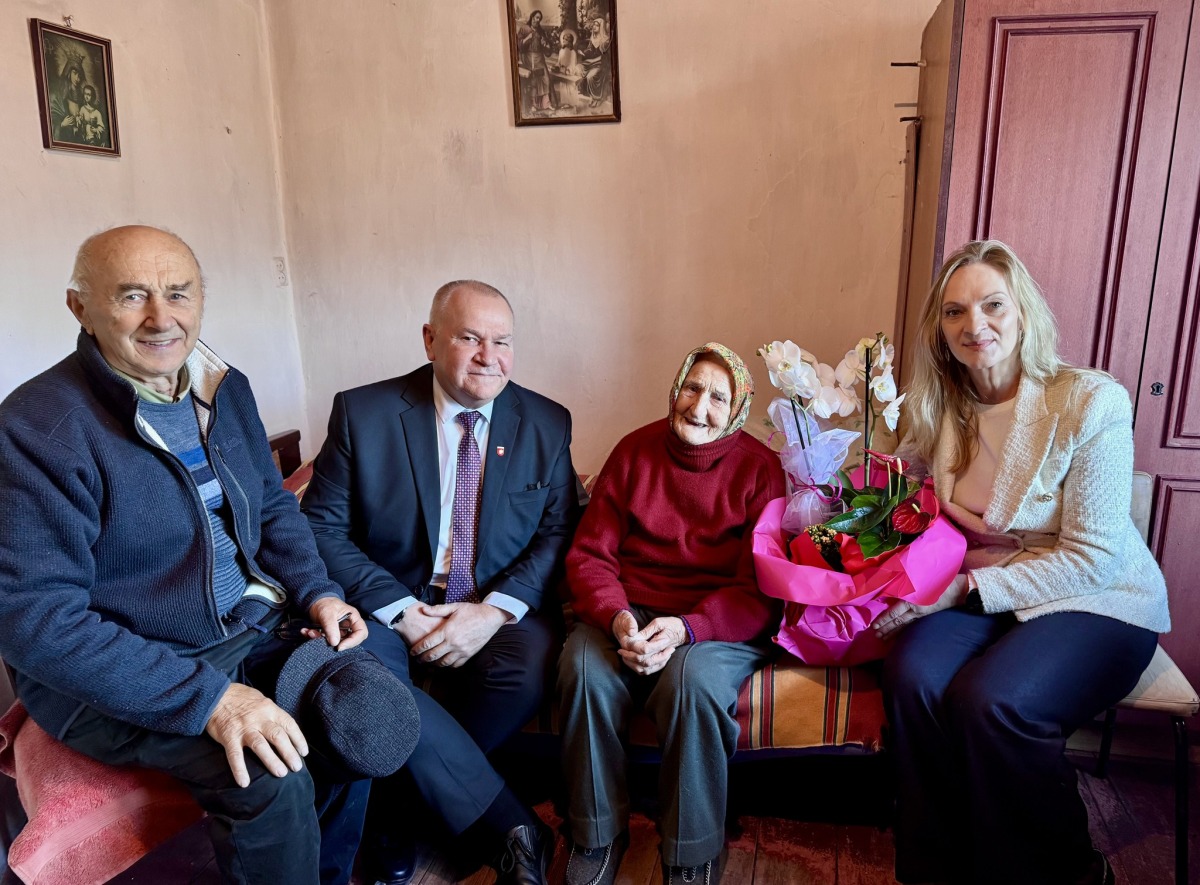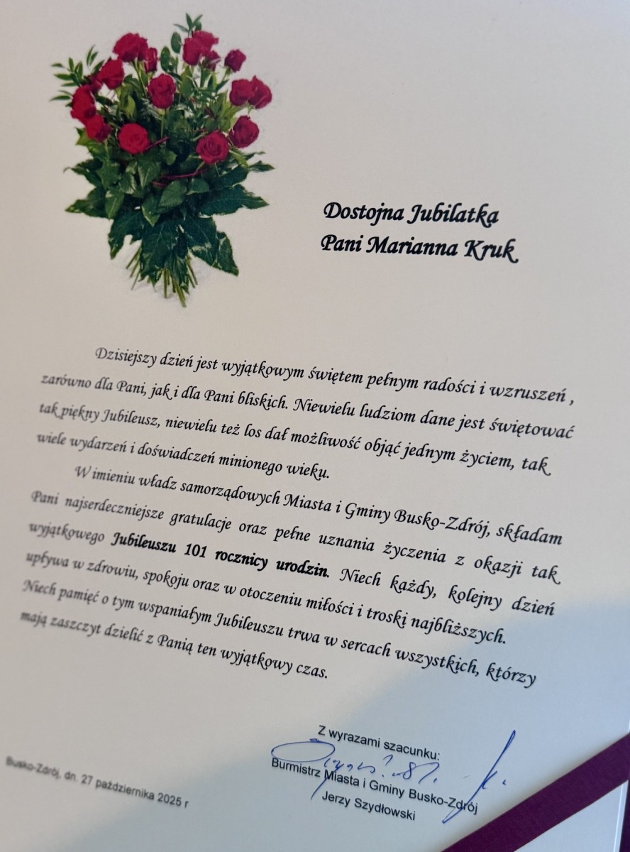 Podczas wizyty Piotr Kaczocha przekazał Pani Mariannie list gratulacyjny od Burmistrza Miasta i Gminy Busko-Zdrój Jerzego Szydłowskiego, w którym podkreślono wyjątkowy charakter jubileuszu oraz wyrażono uznanie dla bogatego życiowego doświadczenia Jubilatki. W liście znalazły się słowa: