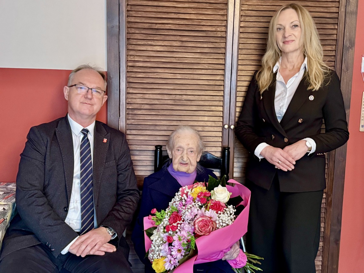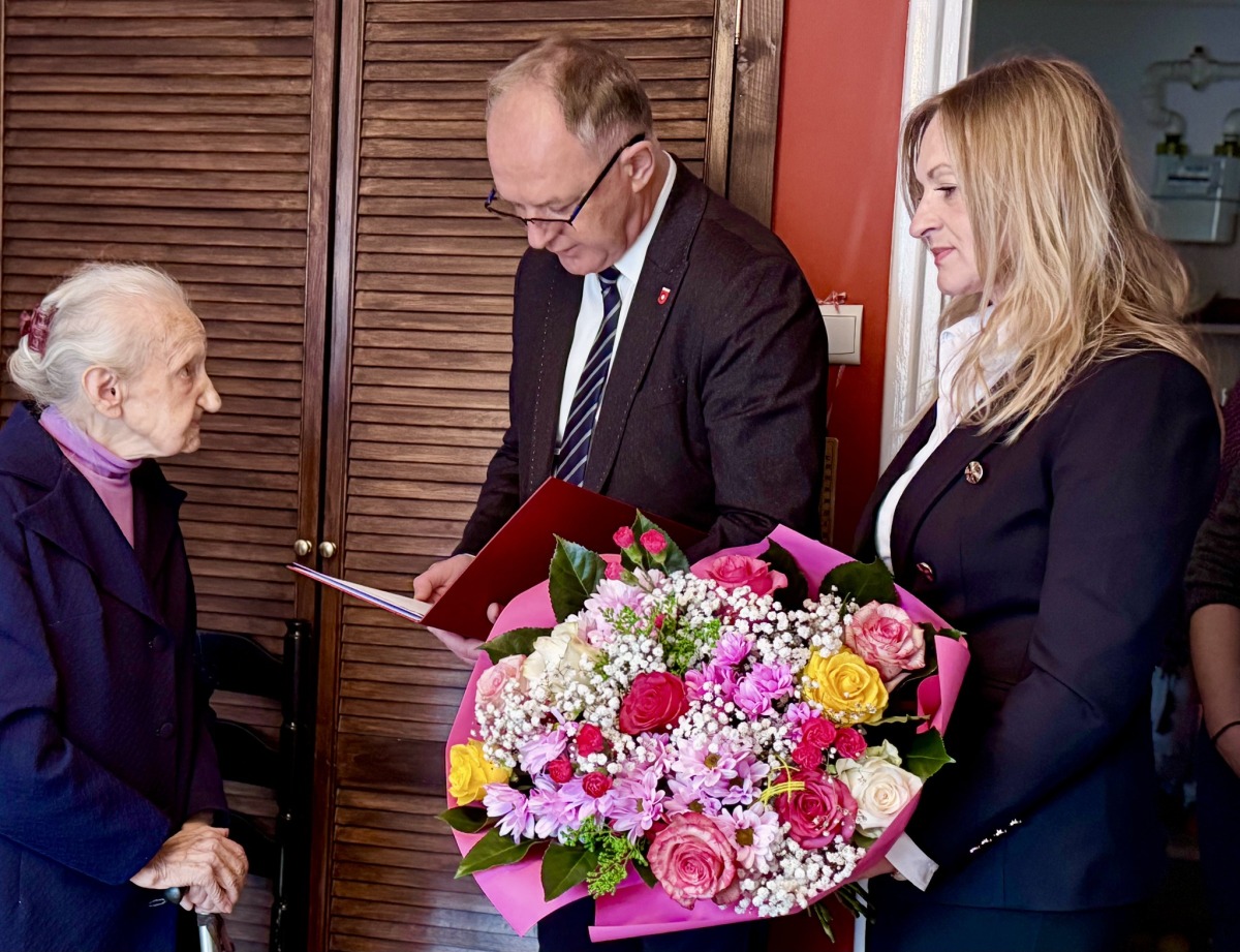 Pani Krystyna Mucha, mieszkanka Buska-Zdroju, obchodzi dziś wyjątkowy jubileusz - swoje setne urodziny. Z tej okazji Burmistrz Miasta i Gminy Busko-Zdrój Jerzy Szydłowski oraz Kierownik Urzędu Stanu Cywilnego Agnieszka Wilk odwiedzili Jubilatkę, by złożyć serdeczne gratulacje, wręczyć kwiaty oraz list okolicznościowy, życząc jej zdrowia, radości i wielu spokojnych lat w otoczeniu najbliższych.