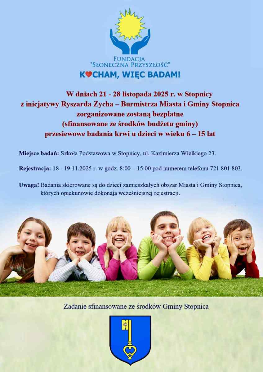 W gminie Stopnica trwają zapisy na bezpłatne, przesiewowe badania krwi dla dzieci w wieku od 6 do 15 lat. To inicjatywa Burmistrza Miasta i Gminy Stopnica Ryszarda Zycha, realizowana we współpracy z Fundacją 'Słoneczna Przyszłość' i finansowana ze środków budżetu gminy.