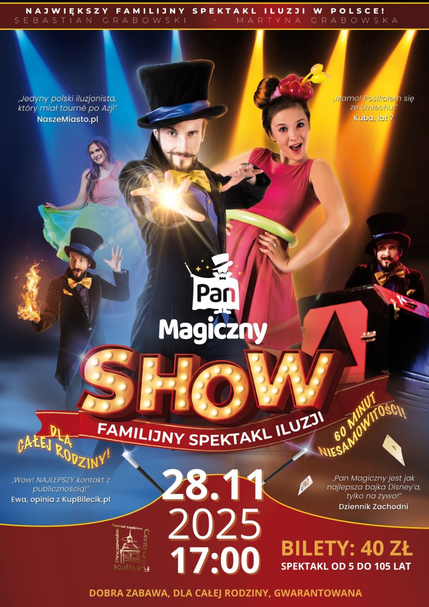 W piątek, 28 listopada 2025 roku, o godzinie 17:00 w sali kinowej odbędzie się familijny spektakl iluzji z udziałem Pana Magicznego - artysty znanego z widowiskowych pokazów i doskonałego kontaktu z publicznością. Wydarzenie zostało przygotowane z myślą o całych rodzinach, a organizatorzy podkreślają, że dobra zabawa nie zna granicy wieku.