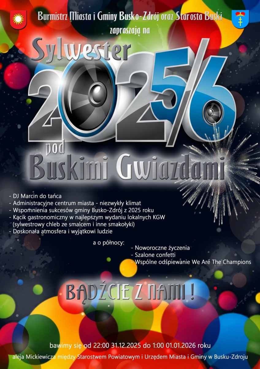 Sylwestrowa zabawa rozpocznie się o godzinie 22.00 w nocy z 31 grudnia 2025 roku na 1 stycznia 2026 roku i potrwa do godziny 1.00. Miejscem spotkania będzie Aleja Mickiewicza, na odcinku pomiędzy Starostwem Powiatowym a Urzędem Miasta i Gminy w Busku-Zdroju.