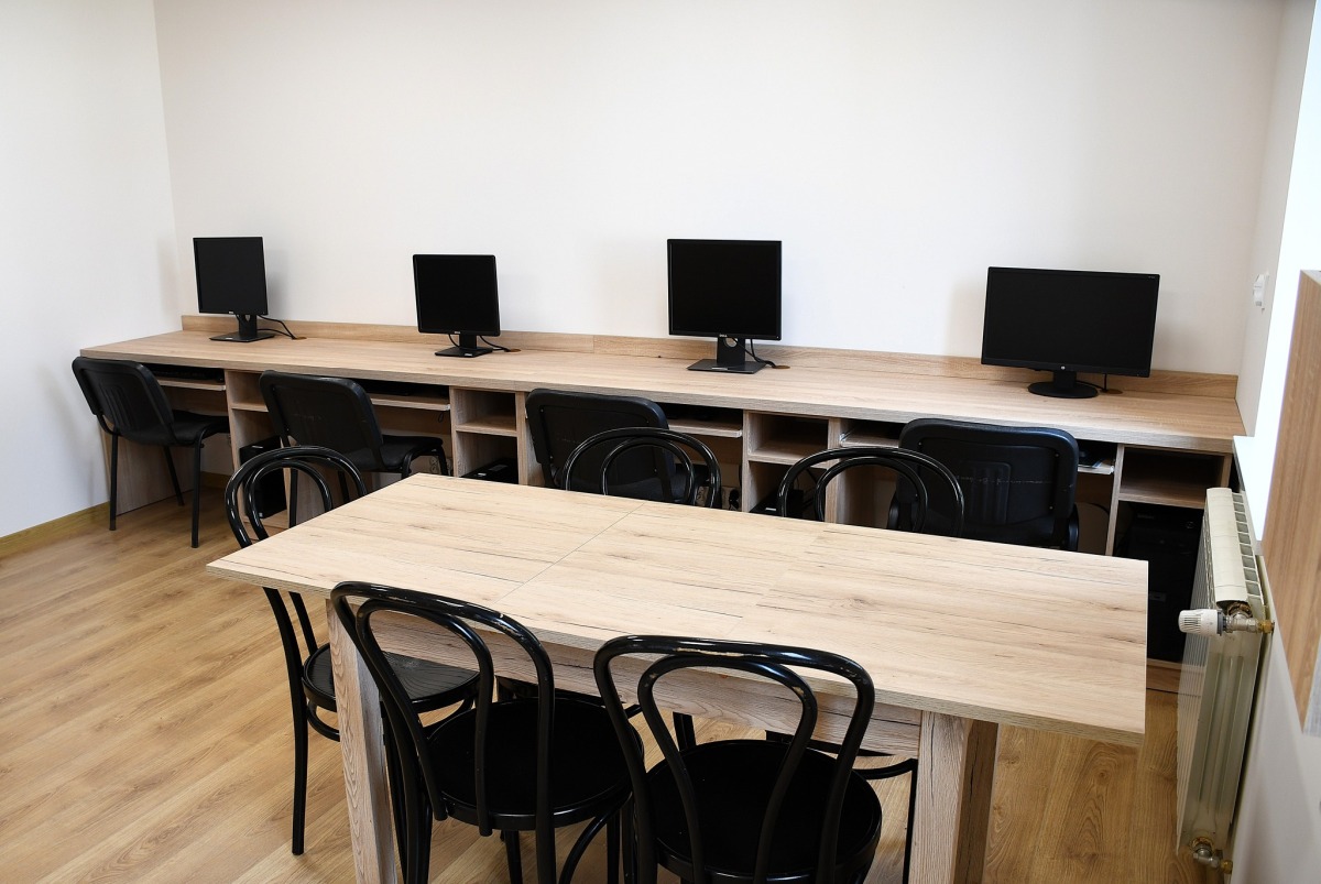 Pracownia komputerowa została przeniesiona do większego pomieszczenia i przystosowana jako nowa pracownia. Zamontowano szafę biurową oraz zabudowę meblową dla czterech stanowisk komputerowych, dzięki czemu z pracy przy komputerze może korzystać większa liczba uczestników, co przeciwdziała ich cyfrowemu wykluczeniu.