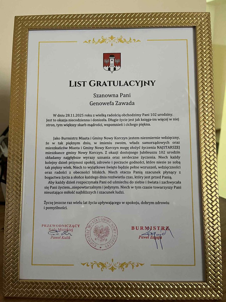 Z okazji tak doniosłego jubileuszu burmistrz Nowego Korczyna Paweł Zagaja, w imieniu samorządu, Rady Miejskiej oraz całej społeczności gminy, złożył pani Genowefie Zawada najserdeczniejsze życzenia zdrowia, pomyślności i kolejnych lat życia w otoczeniu bliskich. Podkreślił również, że jubilatka od lat roztacza wokół siebie ciepło, serdeczność i pogodę ducha, które pozostają wzorem dla wielu mieszkańców gminy.