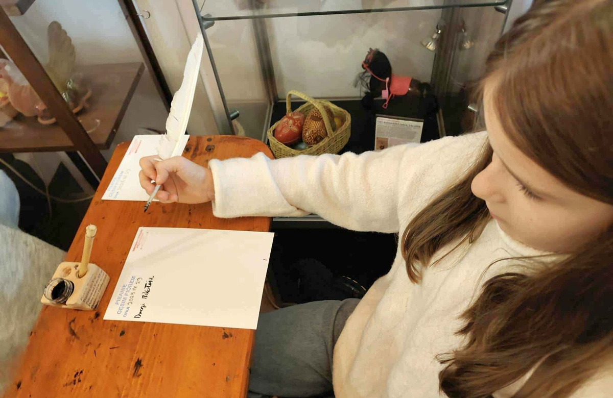 Kolejna grupa uczestniczyła w warsztatach pisania gęsim piórem, patykiem lub trzciną. Dzieci mogły poznać historię atramentu i dowiedzieć się, jak powstawało dawniej pismo. Warsztaty przeniosły dzieci i opiekunów w klimat dawnej szkoły - uczestnicy siedzieli w starych ławkach z kałamarzem, co pozwoliło im poczuć atmosferę minionych czasów.
