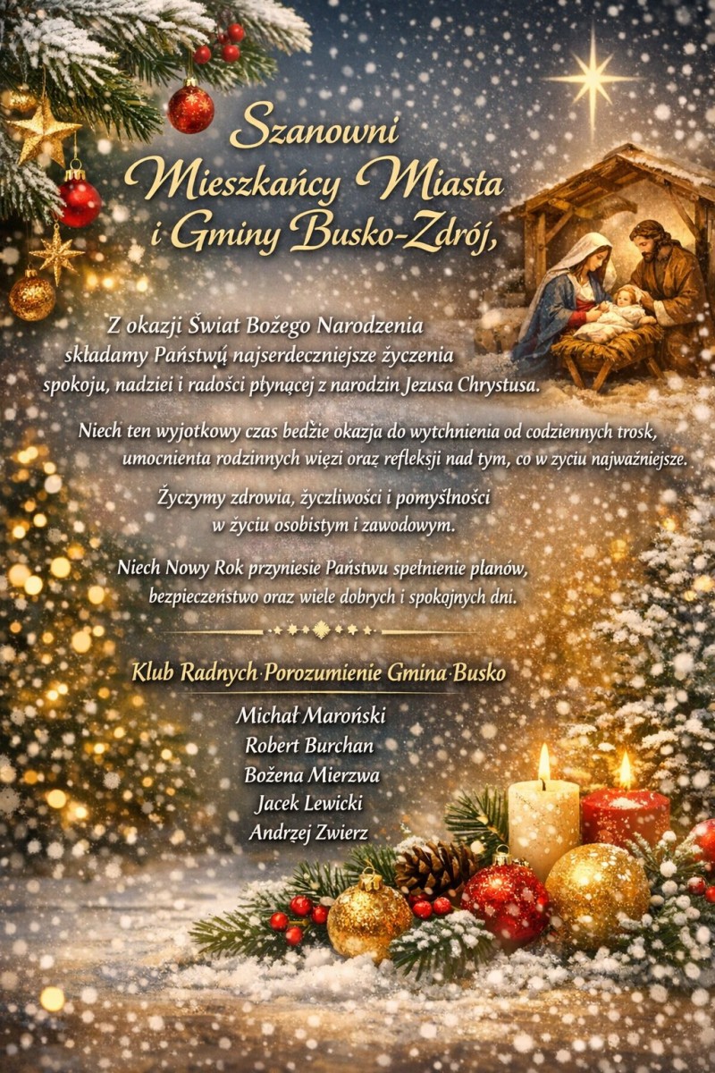 Klub Radnych Porozumienie Gmina Busko kieruje do Mieszkańców Miasta i Gminy Busko-Zdrój świąteczne życzenia z okazji Świąt Bożego Narodzenia oraz zbliżającego się Nowego Roku.