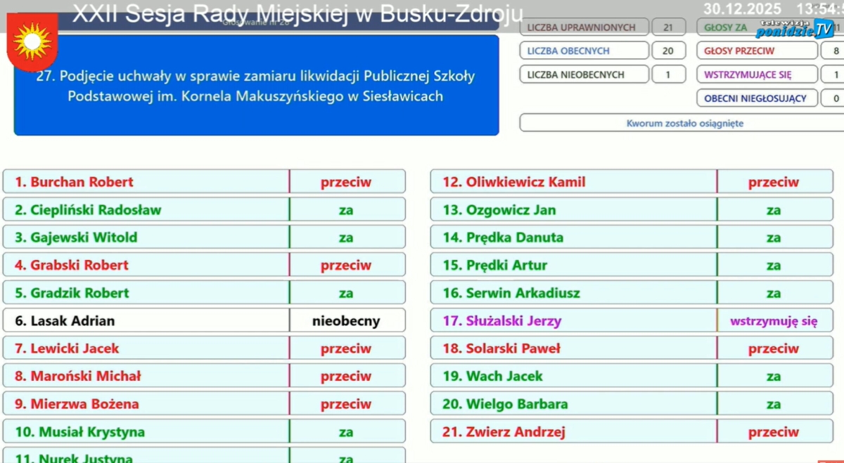Podczas dzisiejszej XXII sesji Rady Miejskiej w Busku-Zdroju radni przegłosowali uchwałę w sprawie zamiaru likwidacji Publicznej Szkoły Podstawowej im. Kornela Makuszyńskiego w Siesławicach. Decyzja ta rozpoczyna formalną procedurę przewidzianą w przepisach prawa oświatowego.