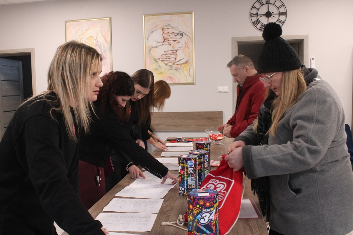 W Centrum Kultury natomiast pracowa³ sztab, który czuwa³ nad przebiegiem i zakoñczeniem internetowych licytacji. Kamila Jamro¿y, Klaudia Pa³ka, Ma³gorzata Szkwarek, Iwona Kapusta, Bo¿ena Ta³aj, Tomasz Wolski i pracuj±ca „on-line” Eliza Mazur – to ich intensywne dzia³ania, wielkie zaanga¿owanie i determinacja przynios³y ogrom fantów i sprawn± organizacjê Fina³u Orkiestry. Prace sztabu wspar³a tak¿e swoj± prac± Wiktoria Kowalik. Po po³udniu na placu utworzy³o siê „orkiestrowe” miasteczko, oferuj±ce licytacje „na ¿ywo”, wystêpy artystyczne i strefê gastronomiczn±. Jednocze¶nie w Centrum mieszkañcy odbierali wylicytowane fanty i zape³niali puszki. Koncert rozpocz±³ Tomasz Mazur - kierownik Centrum Kultury w Tuczêpach i dyrygent tuczêpskiej Wielkiej Orkiestry. Razem z Marcinem Opozd± przeprowadzili licytacje, rozpoczynaj±c od wspania³ego tortu. Tradycyjnie wygra³a go Rada Gminy Tuczêpy wraz z wójtem gminy Jackiem Wilkiem. Tort trafi³ do uczestników Fina³u. Kolejne licytacje przynosi³y wiele u¶miechu i realne kwoty do puszek.