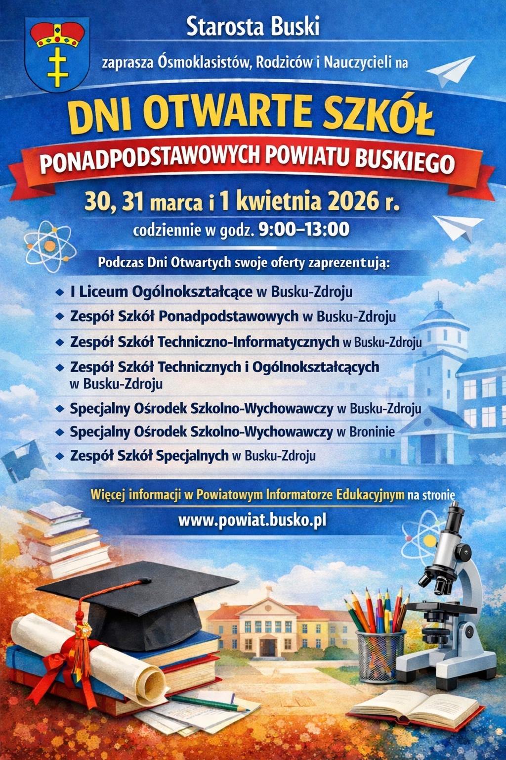 Wybór szkoły ponadpodstawowej to jedna z pierwszych poważnych decyzji w życiu młodego człowieka. W dniach 30 i 31 marca oraz 1 kwietnia 2026 roku - uczniowie szkół podstawowych będą mieli okazję z bliska poznać ofertę edukacyjną placówek prowadzonych przez Powiat Buski podczas Dni Otwartych Szkół Ponadpodstawowych.