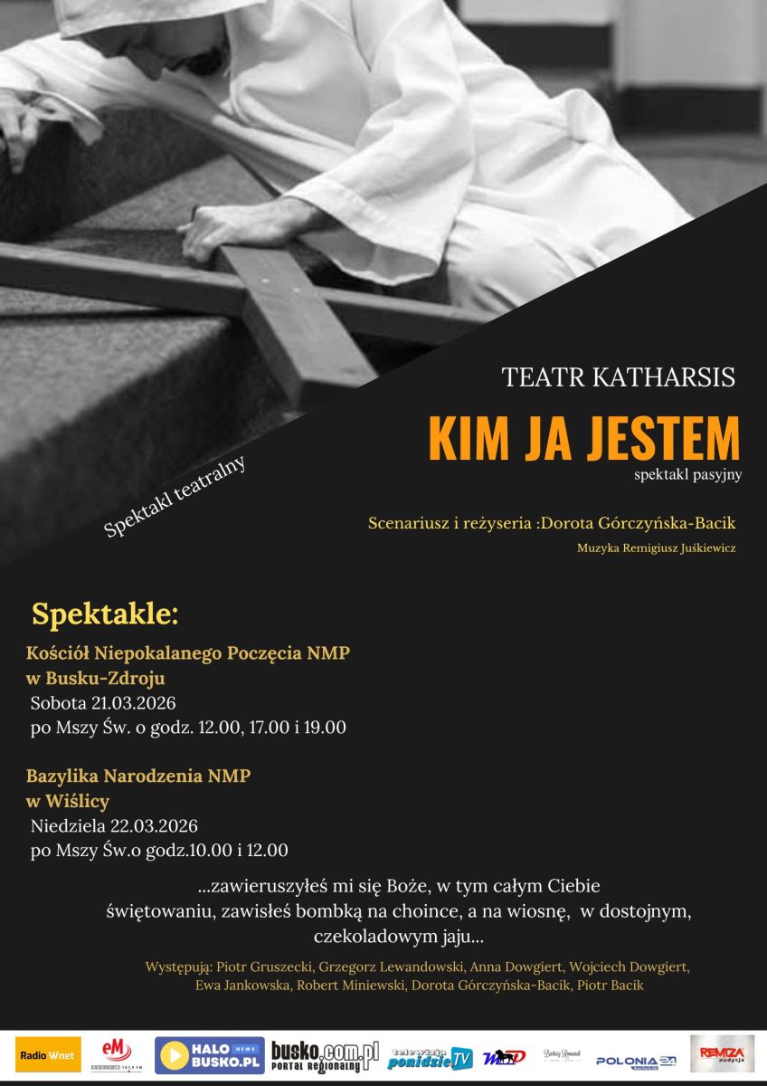 Poruszający spektakl pasyjny 'Kim ja jestem' ponownie zostanie zaprezentowany mieszkańcom regionu. W sobotę 21 marca 2026 roku w Busku-Zdroju oraz w niedzielę 22 marca 2026 roku w Wiślicy widzowie będą mogli zobaczyć wyjątkowe przedstawienie w wykonaniu Teatru Katharsis.