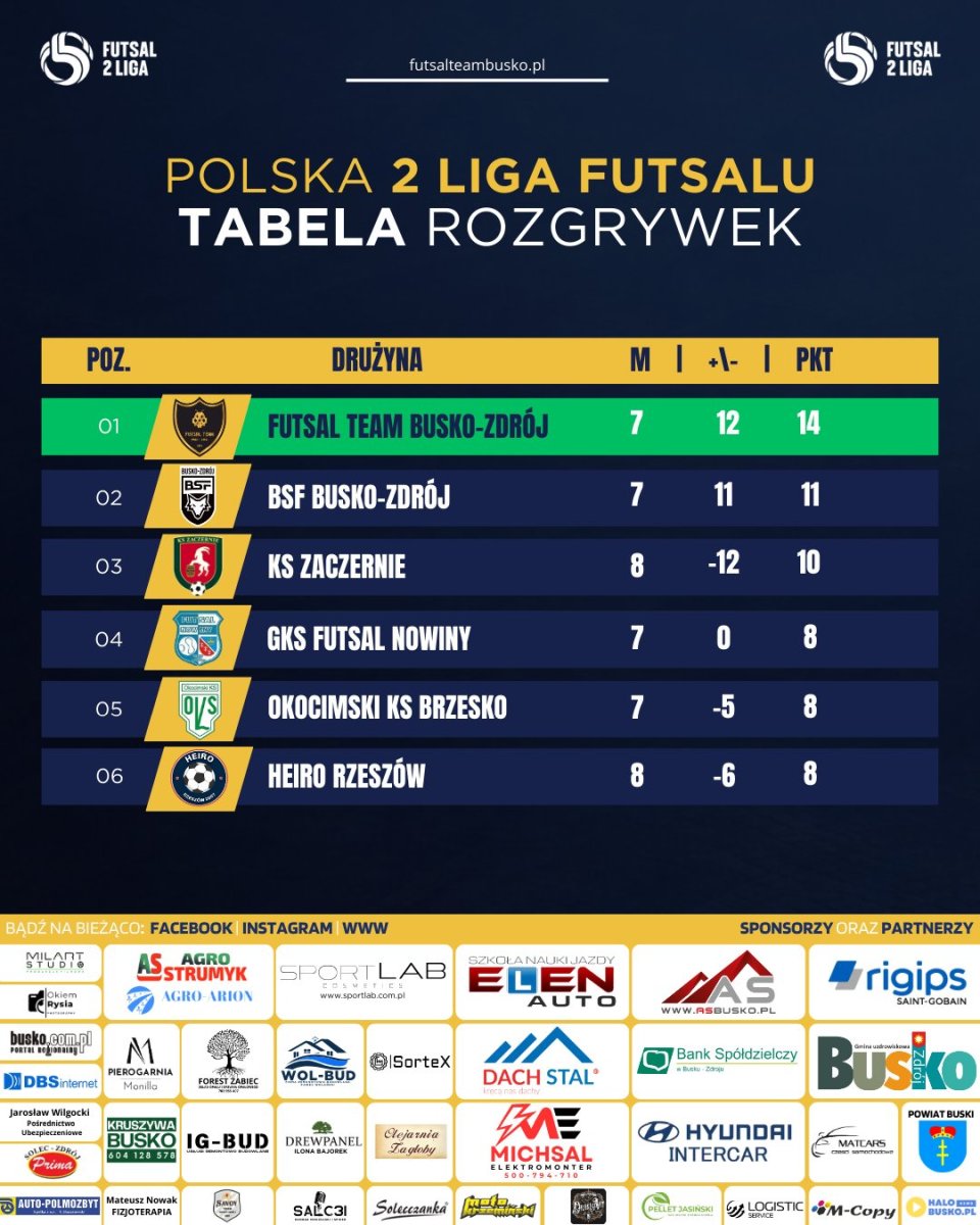 Po rozegranych kolejkach BSF Busko-Zdrój zajmuje drugie miejsce w tabeli z dorobkiem 11 punktów po siedmiu meczach i bilansem bramek 27–16. Liderem pozostaje Futsal Team Busko-Zdrój, który zgromadził 14 punktów.