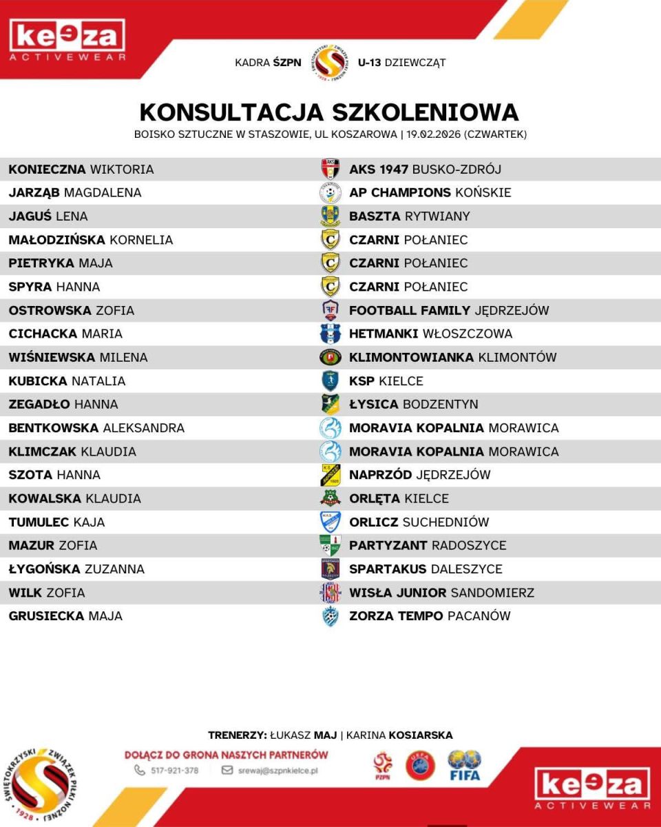 Konsultacja odbędzie się w czwartek, 19 lutego 2026 roku, na boisku ze sztuczną nawierzchnią na obiektach Pogoni Staszów. W zajęciach weźmie udział 20 zawodniczek reprezentujących 17 klubów z regionu świętokrzyskiego.