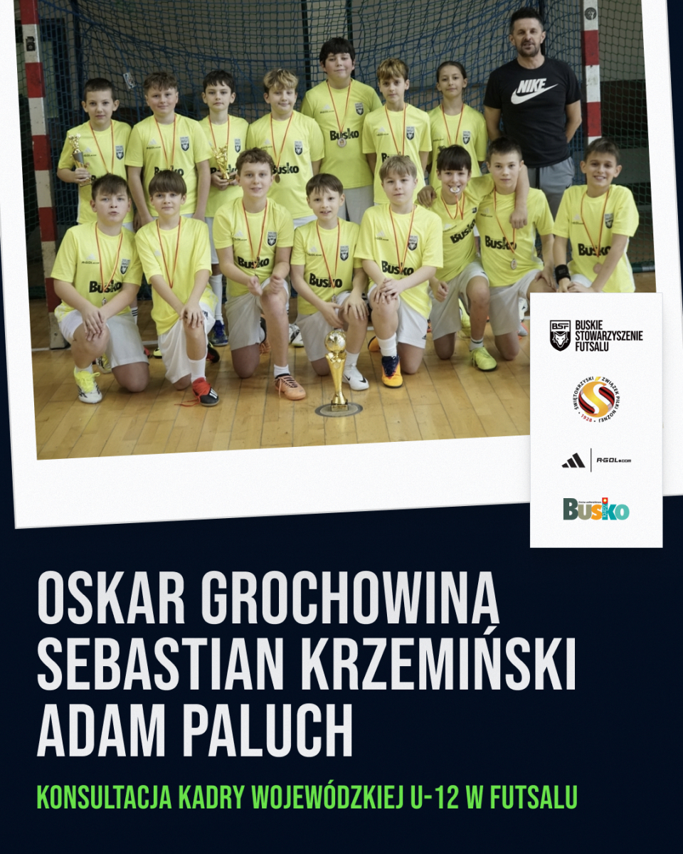 Młodzi zawodnicy z Buska-Zdroju ponownie potwierdzają, że rosną nam piłkarskie talenty. Oskar Grochowina, Sebastian Krzemiński oraz Adam Paluch otrzymali powołanie do szerokiej kadry województwa świętokrzyskiego w futsalu w kategorii U-12.