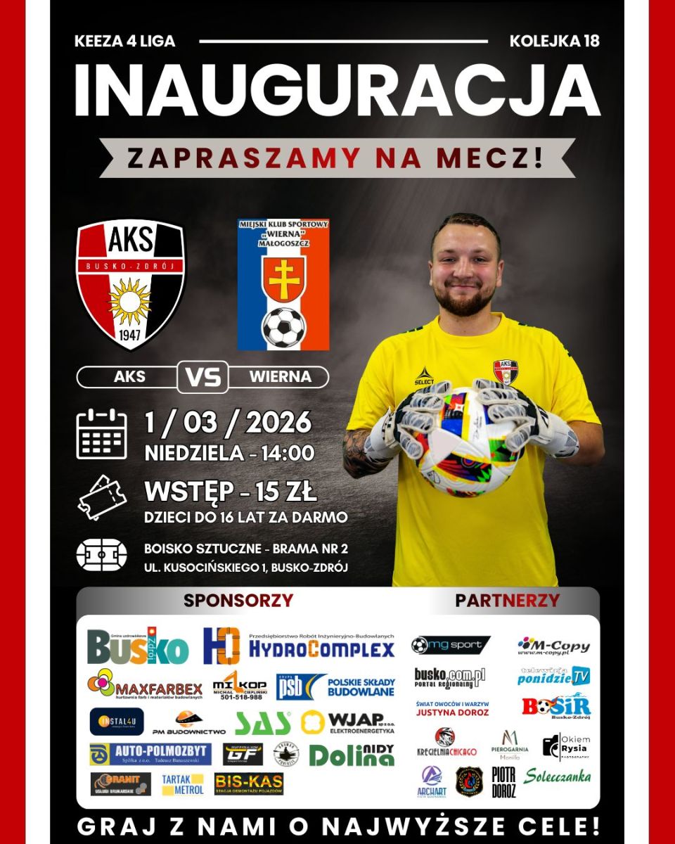 Inauguracja rundy wiosennej odbędzie się w niedzielę, 1 marca. W ramach 18. kolejki AKS 1947 Busko-Zdrój zmierzy się na Stadionie Miejskim z Wierną Małogoszcz. Początek spotkania zaplanowano na godzinę 14:00. Jesienny mecz obu drużyn zakończył się porażką busczan 0:3.