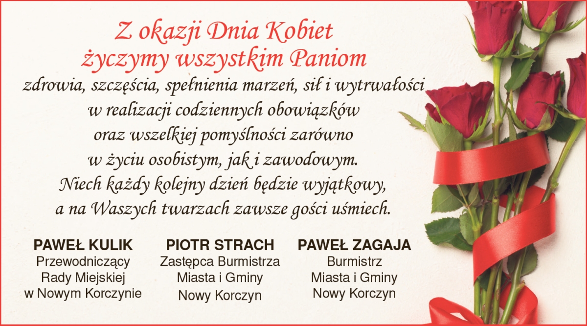Dzień Kobiet to szczególna okazja, by wyrazić wdzięczność, szacunek i uznanie dla wszystkich Pań. Z tej okazji burmistrz Nowego Korczyna Paweł Zagaja, jego zastępca Piotr Strach oraz przewodniczący Rady Miejskiej Paweł Kulik przekazują mieszkankom gminy serdeczne życzenia.