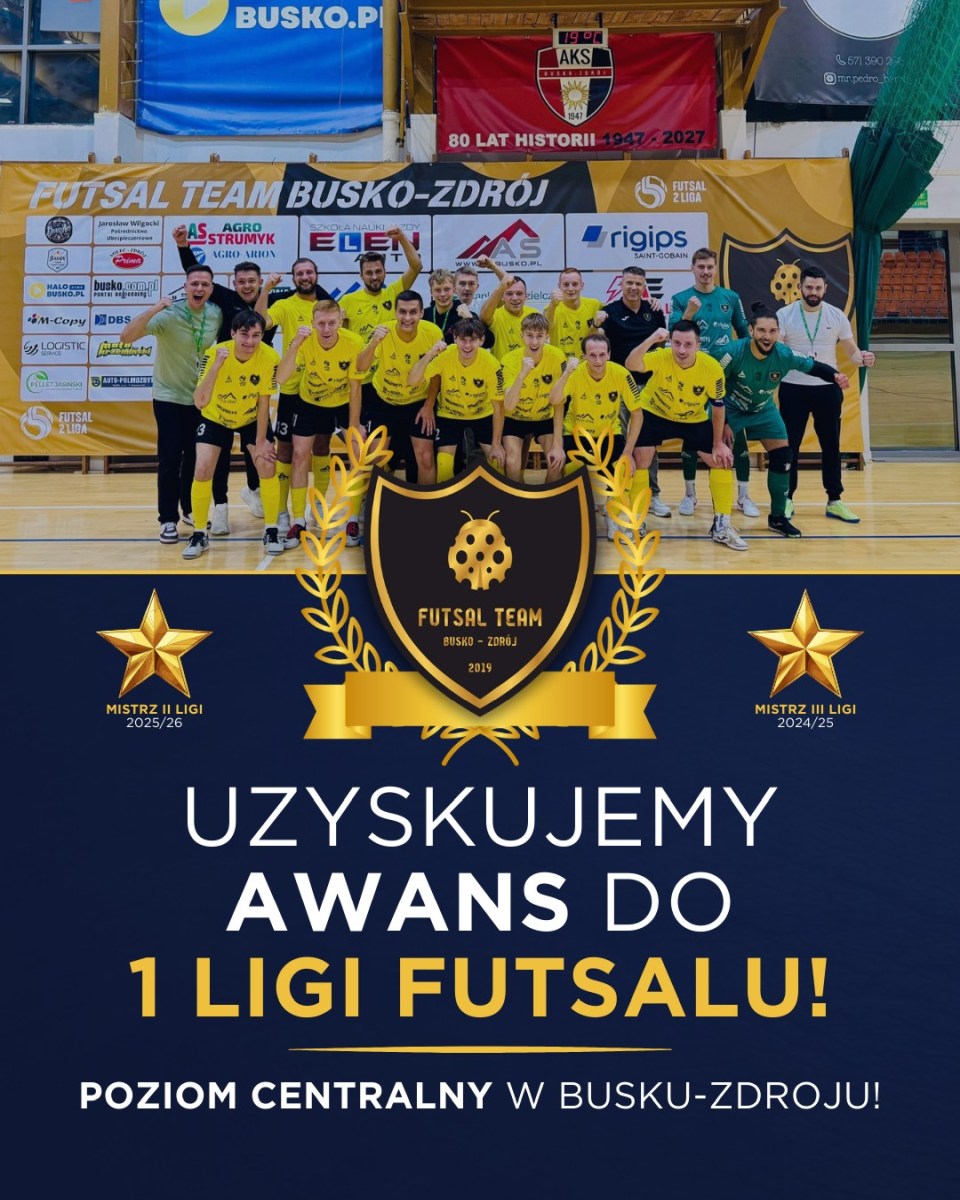 Futsal Team Busko-Zdrój zapewnił sobie awans do 1. Ligi Futsalu. Na jedną kolejkę przed zakończeniem sezonu II ligi futsalu (grupa IV) zespół z Buska-Zdroju jest już pewny pierwszego miejsca w tabeli i promocji na wyższy szczebel rozgrywek.