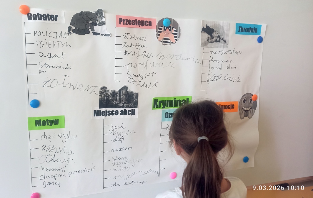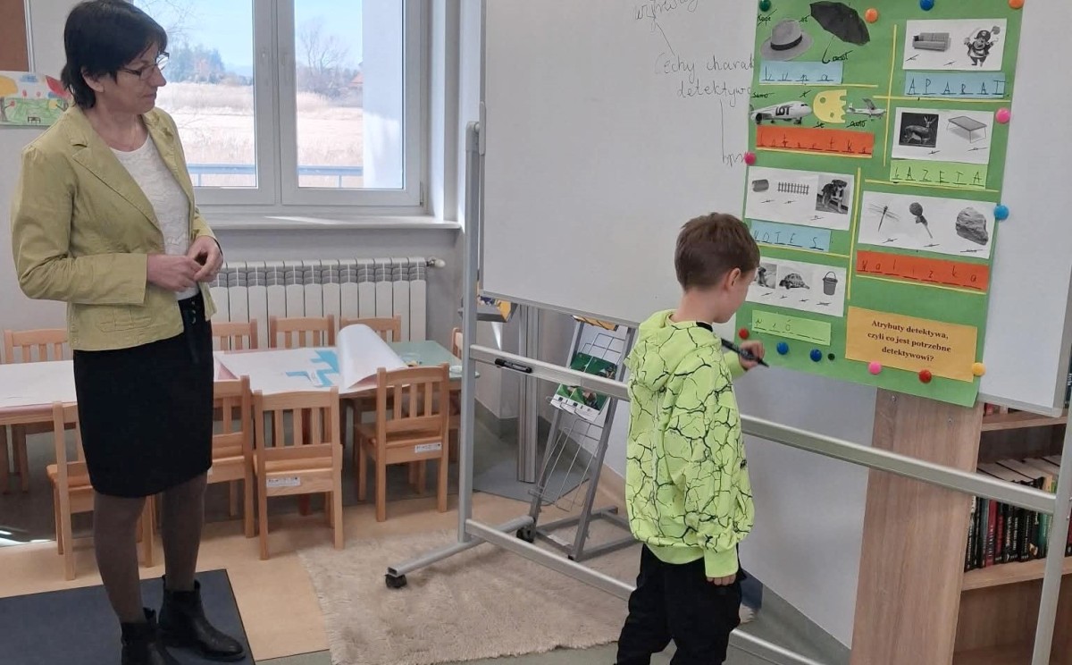Dużym zainteresowaniem cieszyły się również zajęcia „Czytelnicze śledztwo z detektywem Pozytywką, czyli jakim językiem przemawiają ślady i tropy pozostawione na miejscu zdarzenia”, przygotowane dla uczniów klas trzecich. Spotkania miały formę detektywistycznej przygody. Dzieci poznały zawód detektywa, jego cechy charakteru oraz atrybuty niezbędne w tej pracy. Wspólnie analizowały tropy i wskazówki, ucząc się uważnego czytania, logicznego myślenia i wyciągania wniosków.