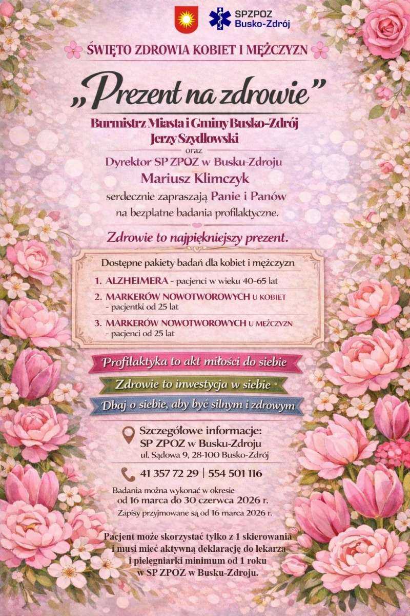 Z okazji Dnia Kobiet i Dnia Mężczyzn w Busku-Zdroju przygotowano wyjątkową inicjatywę prozdrowotną pod hasłem 'Prezent na zdrowie'. Mieszkańcy będą mogli skorzystać z bezpłatnych badań profilaktycznych, których celem jest wczesne wykrywanie chorób oraz promowanie troski o zdrowie.