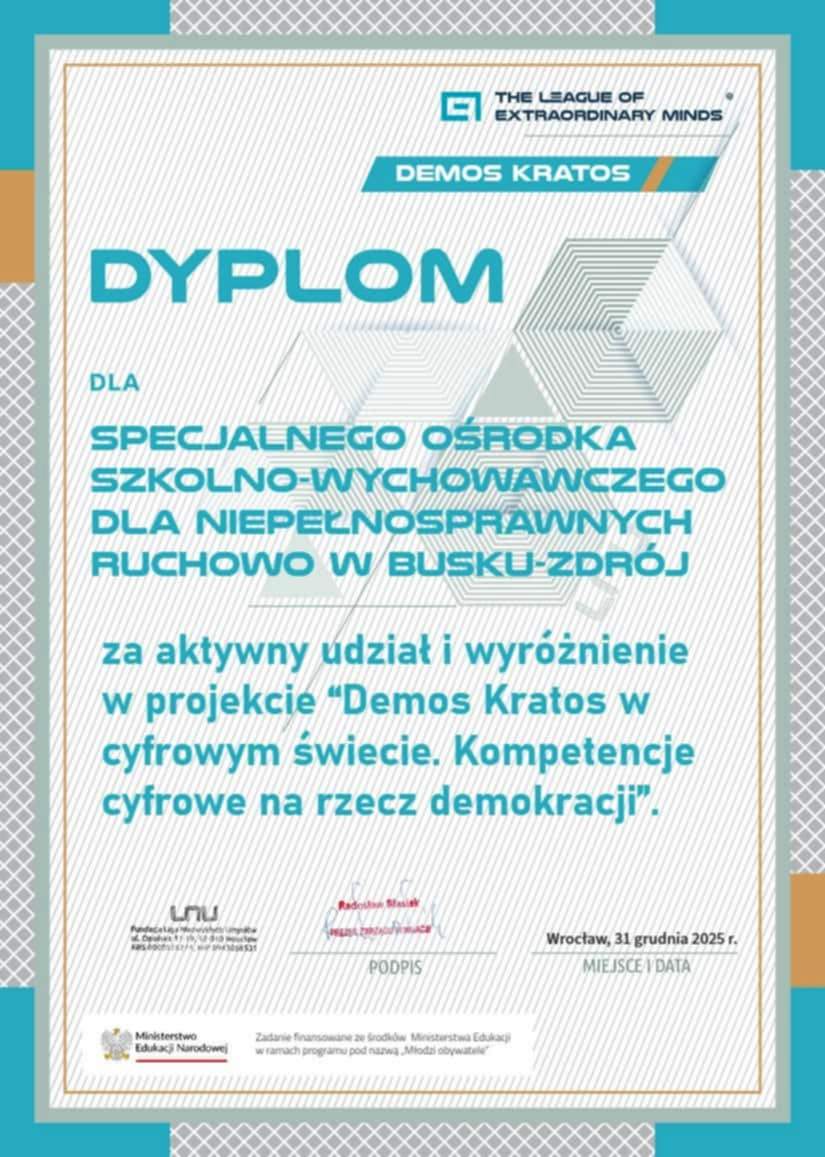 Uczniowie Specjalnego Ośrodka Szkolno-Wychowawczego dla Niepełnosprawnych Ruchowo w Busku-Zdroju zostali wyróżnieni za udział w ogólnopolskim projekcie 'Demos Kratos w cyfrowym świecie', realizowanym w ramach programu 'Młodzi Obywatele'.