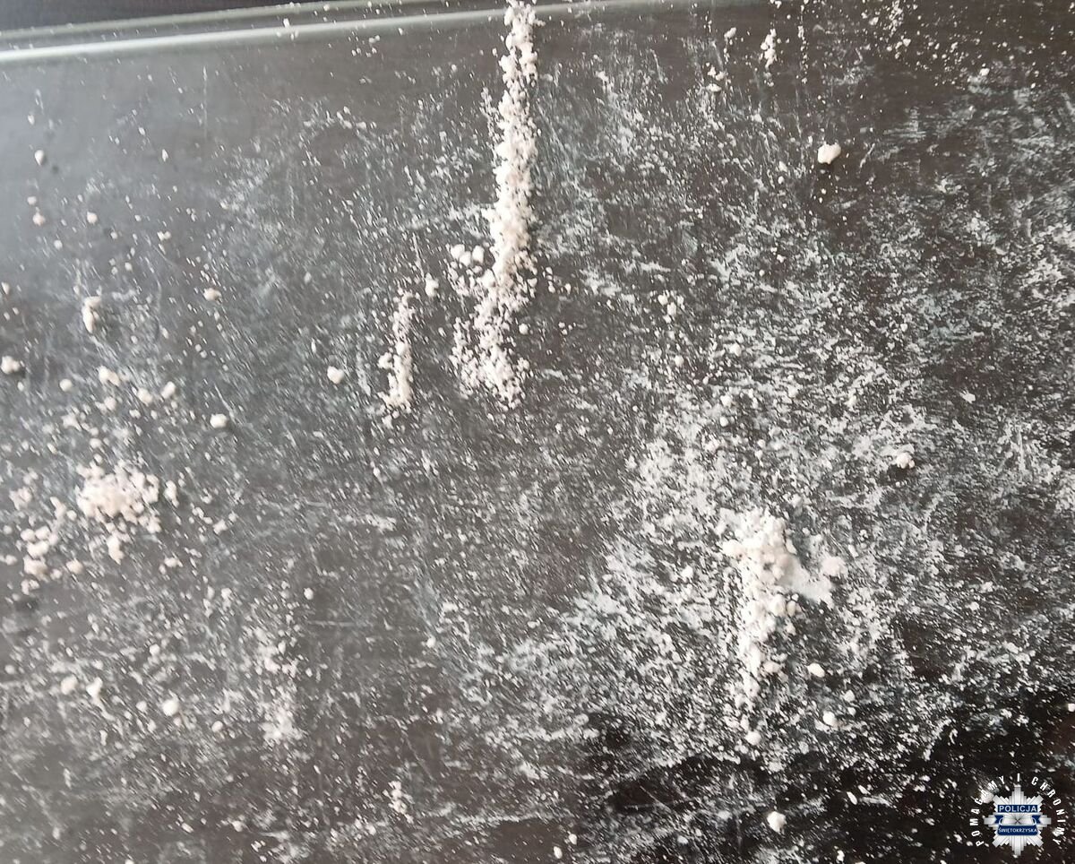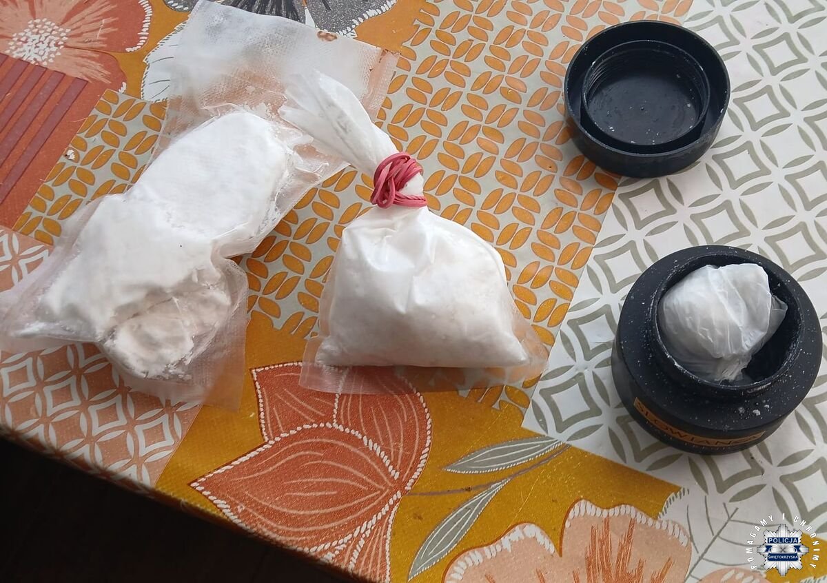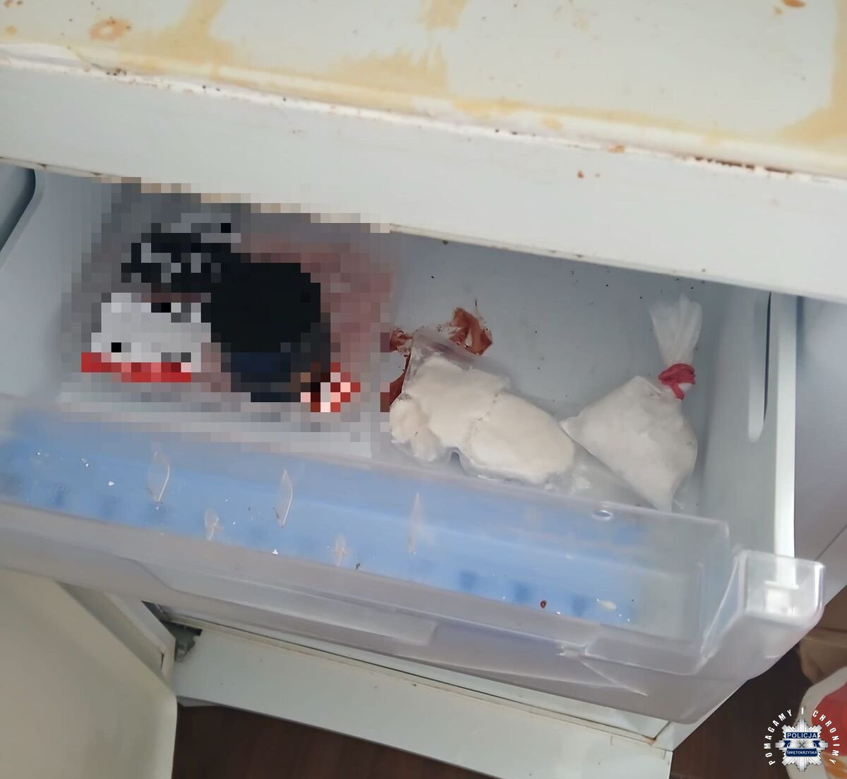 W trakcie czynności policjanci zauważyli niewielkie ilości białego proszku rozsypanego na szkle. Wstępne badanie testerem narkotykowym wykazało, że jest to amfetamina. Podczas dalszego przeszukania w lodówce znaleziono dwa foliowe woreczki z białą substancją. Zabezpieczony proszek o łącznej wadze 180 gramów również został wstępnie zidentyfikowany jako amfetamina.
