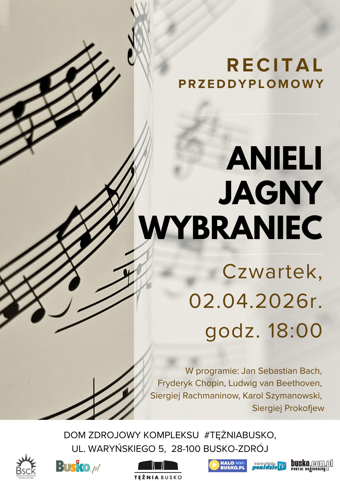 Miłośnicy muzyki klasycznej będą mieli okazję uczestniczyć w wyjątkowym wydarzeniu artystycznym. W Domu Zdrojowym Kompleksu #TężniaBusko odbędzie się recital przeddyplomowy utalentowanej pianistki, pochodzącej z Buska-Zdroju Anieli Jagny Wybraniec.