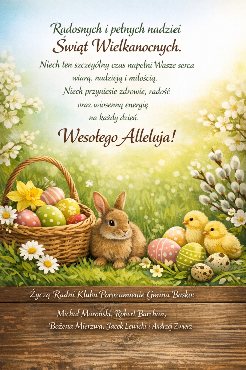 Radosnych i pełnych nadziei Świąt Wielkanocnych. Niech ten szczególny czas napełni Wasze serca wiarą, nadzieja i miłością. Niech przyniesie zdrowie, radość oraz wiosenną energię na każdy dzień. Wesołego Alleluja! Życzą Radni Klubu Porozumienie Gmina Busko: Michał Maroński, Robert Burchan, Bożena Mierzwa, Jacek Lewicki i Andrzej Zwierz.