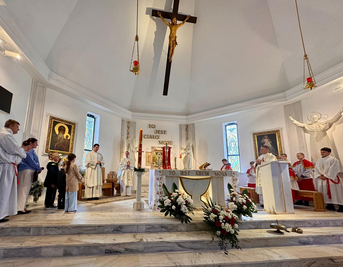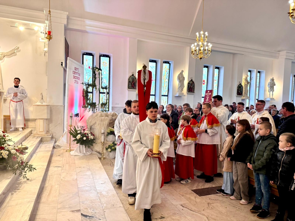 Niedziela Wielkanocna rozpoczęła się tradycyjną rezurekcją. Uroczysta procesja, poprzedzająca Mszę świętą, trzykrotnie obeszła świątynię. Na jej czele niesiono krzyż ozdobiony czerwoną stułą, za nim figurę Chrystusa Zmartwychwstałego oraz monstrancję z Najświętszym Sakramentem. Przy dźwięku dzwonów wierni uczestniczyli w procesji, wyrażając radość ze zmartwychwstania poprzez wspólny śpiew pieśni wielkanocnych, w tym „Wesoły nam dzień dziś nastał”. Liturgia zgromadziła liczne grono parafian i gości.