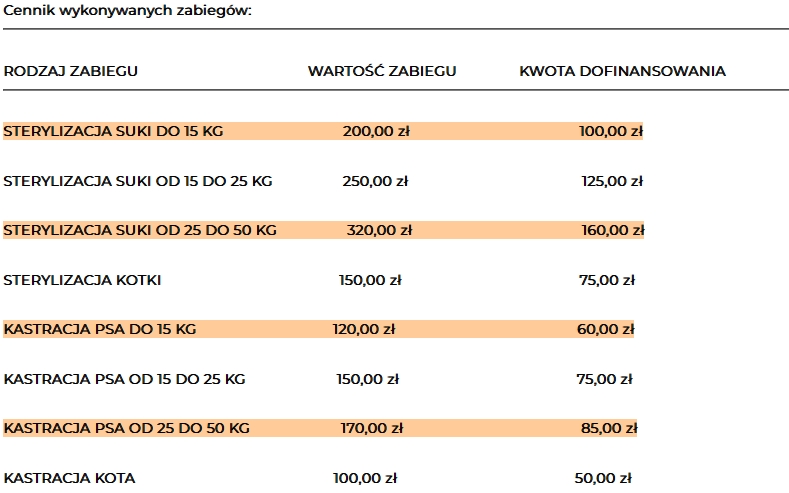 W ciągu roku możliwe jest uzyskanie dofinansowania do jednego zabiegu. Zabiegi będą wykonywane w Gabinecie Weterynaryjnym lekarza weterynarii Stanisława Króla przy ul. Bohaterów Warszawy 6 w Busku-Zdroju.