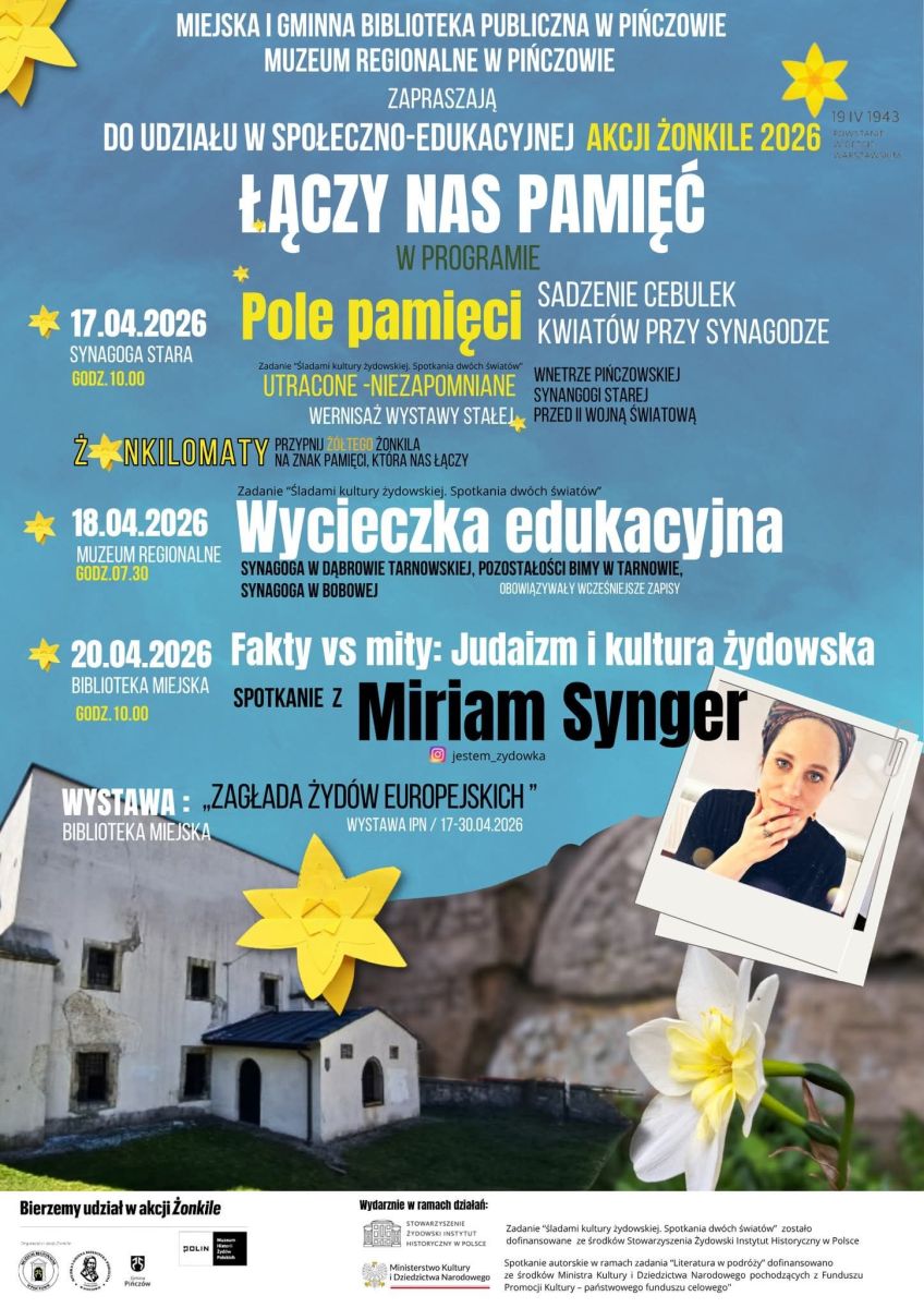 Muzeum Regionalne w Pińczowie oraz Miejska i Gminna Biblioteka Publiczna w Pińczowie zapraszają do udziału w Akcji Żonkile 2026. W dniach od 17 do 20 kwietnia zaplanowano cykl wydarzeń upamiętniających rocznicę powstania w getcie warszawskim oraz skłaniających do refleksji nad historią, pamięcią i współczesnym znaczeniem dialogu międzykulturowego.